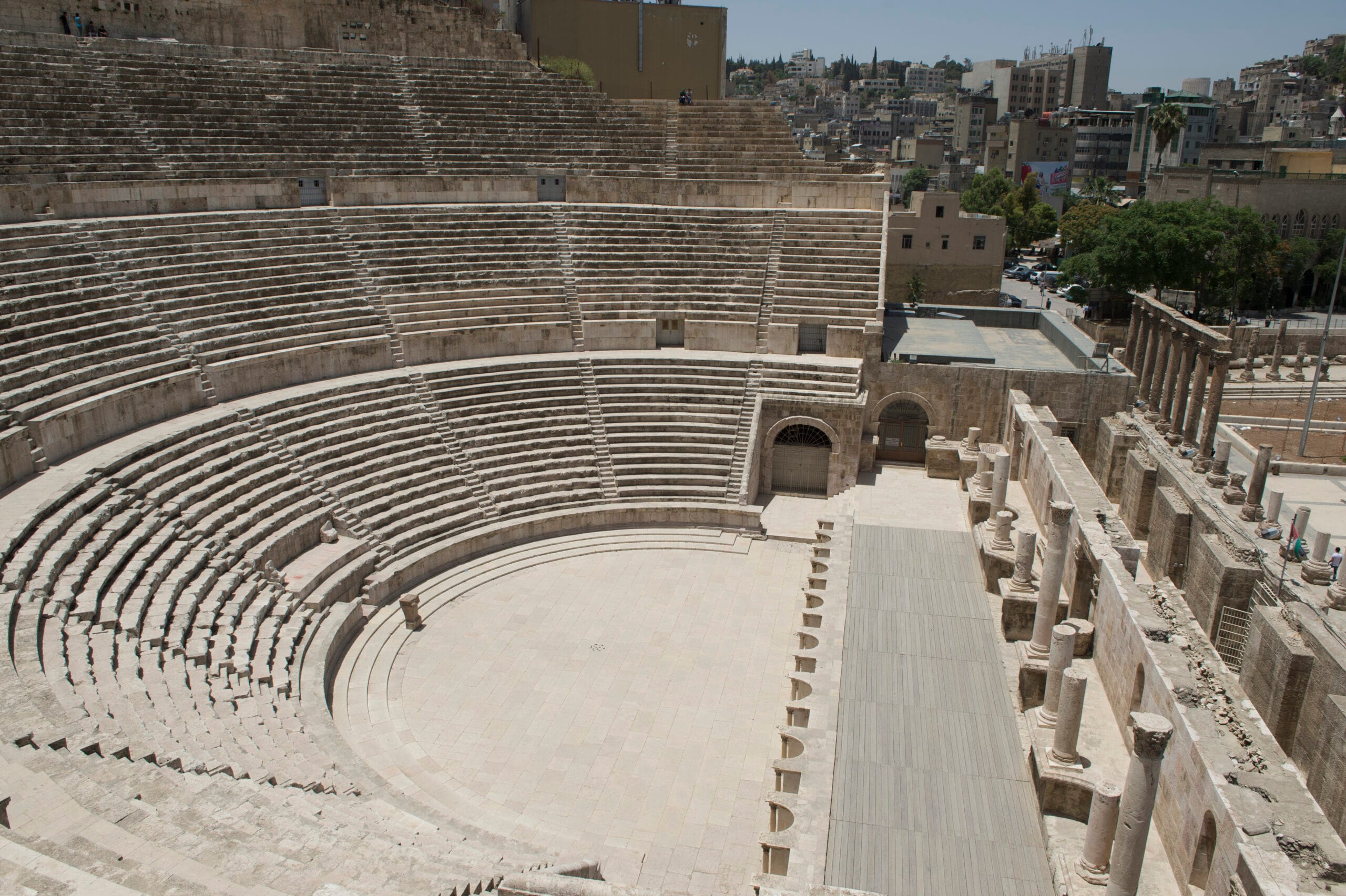 The Roman Theatre of Amman is a large, ancient structure built in the 2nd century CE. It is located in the eastern part of Amman, Jordan, at the foot of Jabal Al-Joufah. This theatre is a prominent landmark in the city, which was known as Philadelphia during the Roman period. The theatre can accommodate approximately 6,000 spectators and is situated near the Odeon and the Roman Nymphaeum.