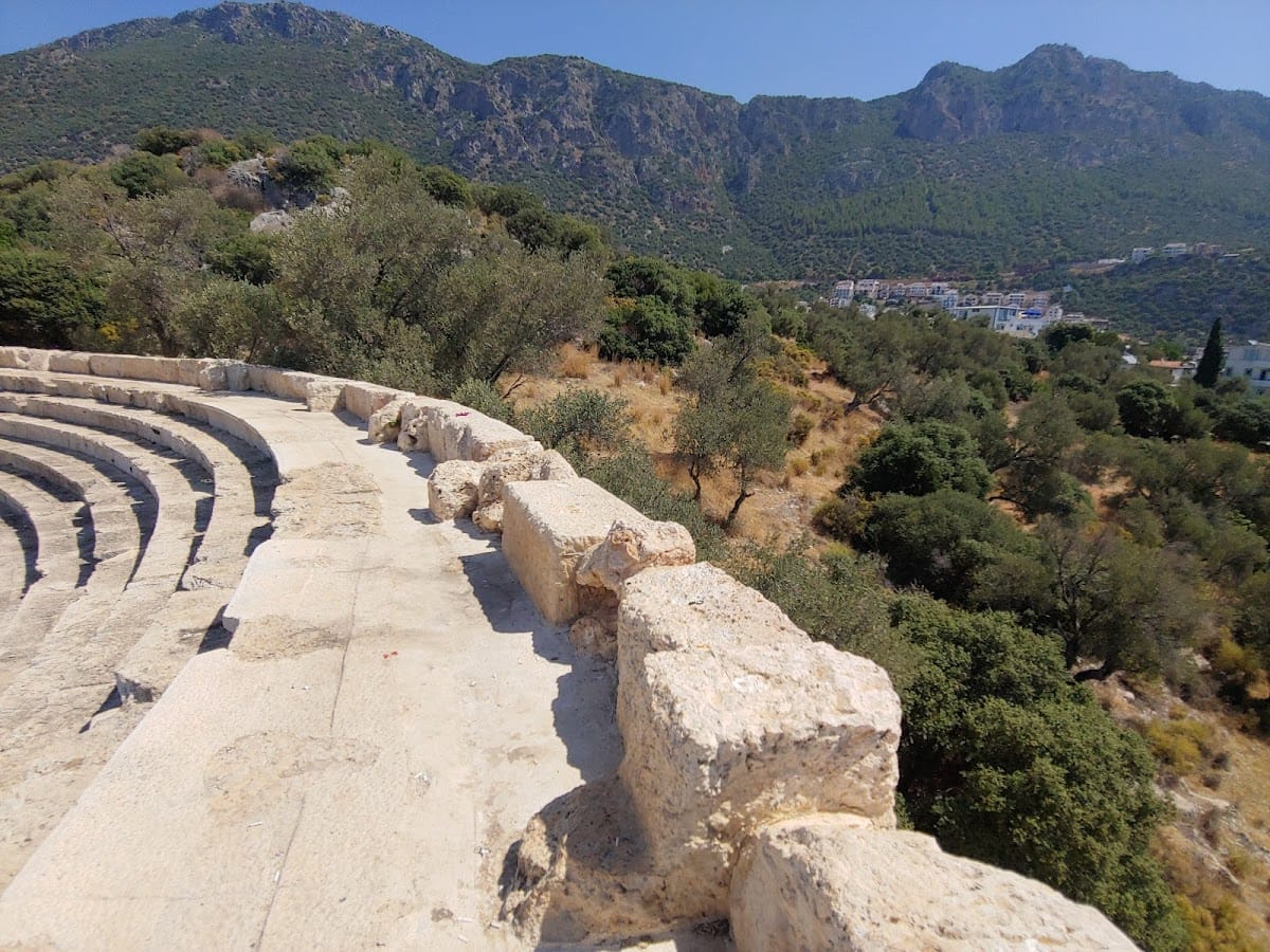 A prominent feature is the Hellenistic theatre, situated about 500 meters from Kaş. It originally seated around 4,000 spectators and is unique in Anatolia for its location facing the sea. The theatre’s retaining wall forms a slightly more than semicircular shape using irregular ashlar blocks, which are carefully cut rectangular stones. It lacks a horizontal passage called a diazoma and does not have a permanent stone stage, preserving the sea view for the audience. The east wall collapsed, likely during the 141 earthquake, and was repaired soon after, probably with funds from Opramoas. The theatre was restored in 2008 and remains largely intact.