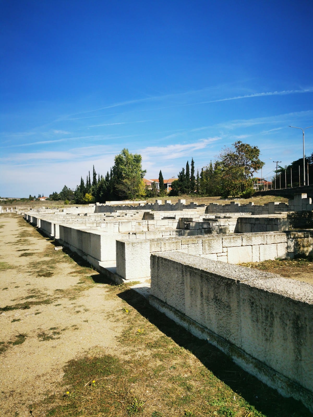 Pella was designed following the Hippodamian plan, a grid layout featuring eight rows of rectangular city blocks. Each block measured roughly 45 meters wide and between 111 and 152 meters long. Streets intersected these blocks at widths of 9 to 10 meters, with a main east-west street reaching up to 15 meters wide. This main street led to a central agora, or marketplace, covering about seven hectares, equivalent to ten city blocks.