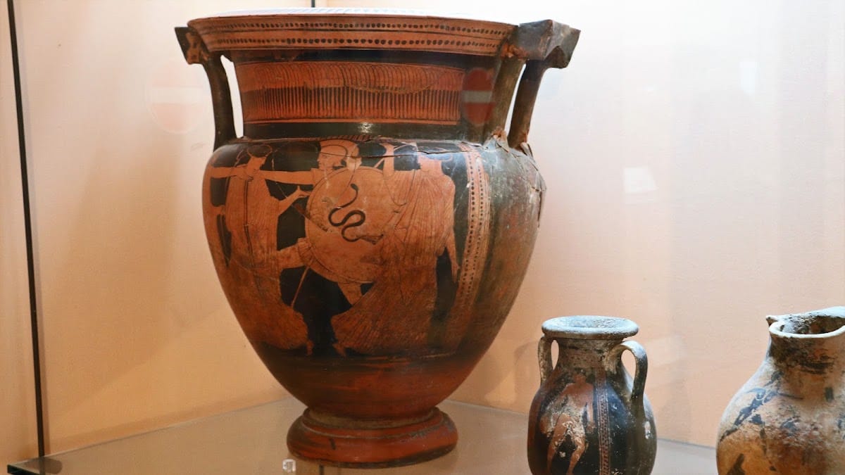 Among the most significant exhibits is the Nestor’s Cup, a ceramic drinking vessel dated between 725 and 720 BCE. It bears one of the earliest known inscriptions in the Greek alphabet, written in the Euboean script.