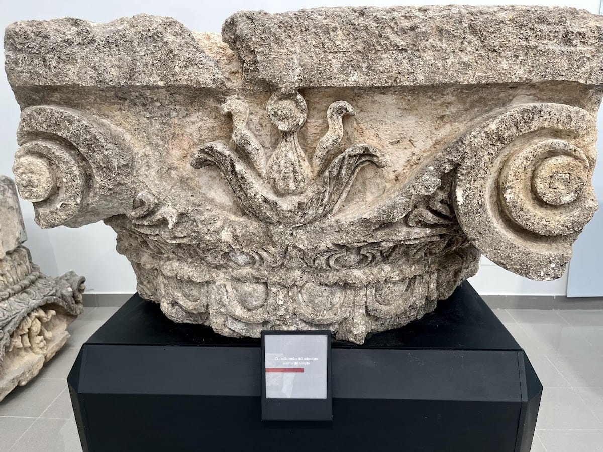 The site preserves remains from both the original Hellenistic temple and the later paleochristian basilica. The temple was constructed on a high, shaped podium with a central staircase flanked by two large telamons, sculpted male figures serving as architectural supports. It featured an external Ionic colonnade topped by a Doric frieze decorated with metopes and triglyphs showing armor motifs. Inside, a second row of columns displayed capitals with female heads emerging from acanthus leaves between spiral volutes.