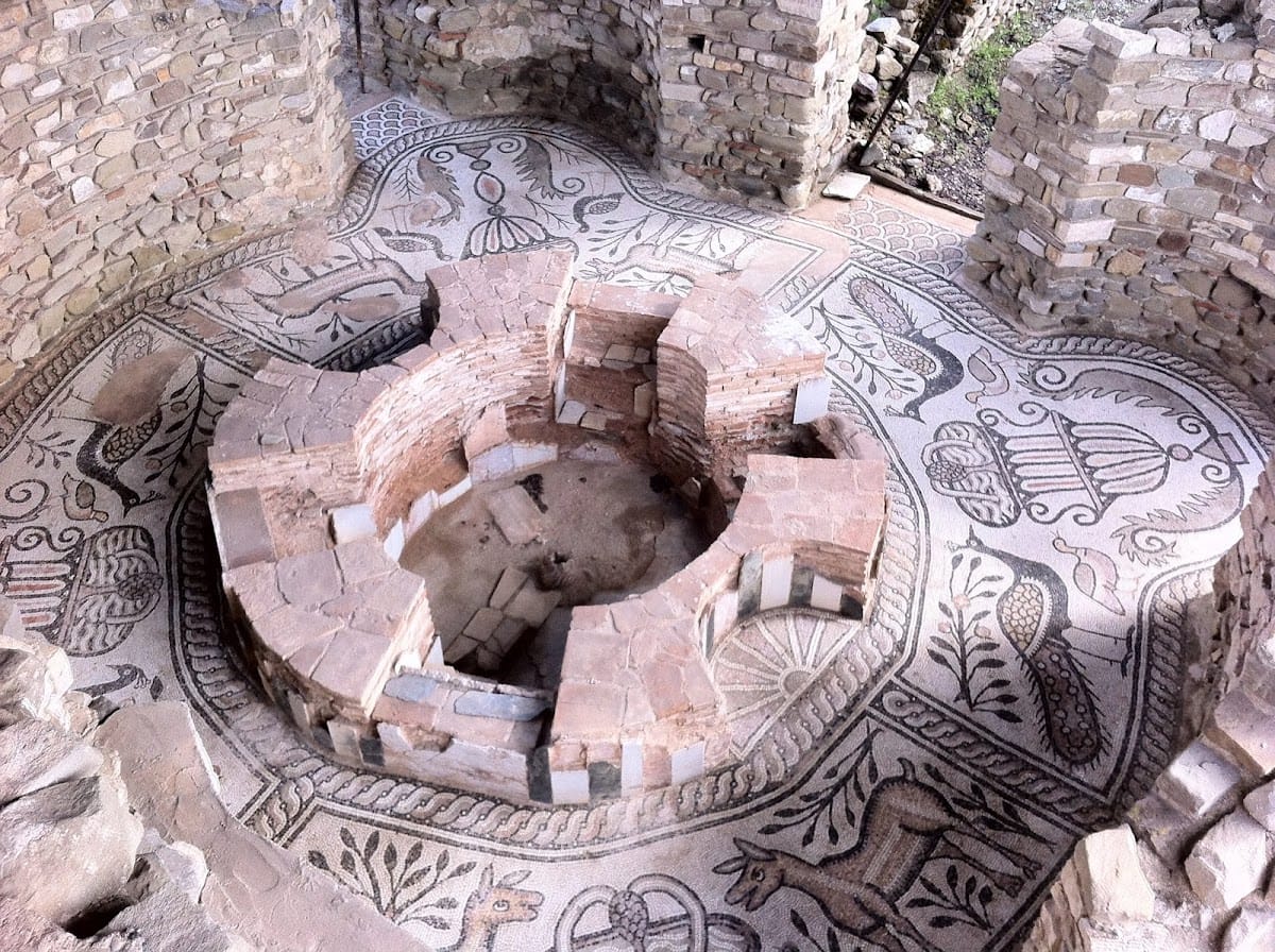 The Casino, a luxurious residence north of the theatre, was excavated in multiple campaigns from 1939 to 2009. Built toward the end of the 4th century CE, it contains numerous rooms with mosaic and marble tile floors. The residence includes a bath with a hypocaust heating system and two small pools, as well as a unique latrine toilet seat. The western end features a peristyle with a pool. Christian symbols and frescoes of saints suggest it served as the bishops’ residence. The building is connected to the Episcopal Basilica by the Via Episcopalis, a street paved with marble seats from the theatre. In the 6th century CE, the residence was rearranged with new dwellings incorporating older walls.