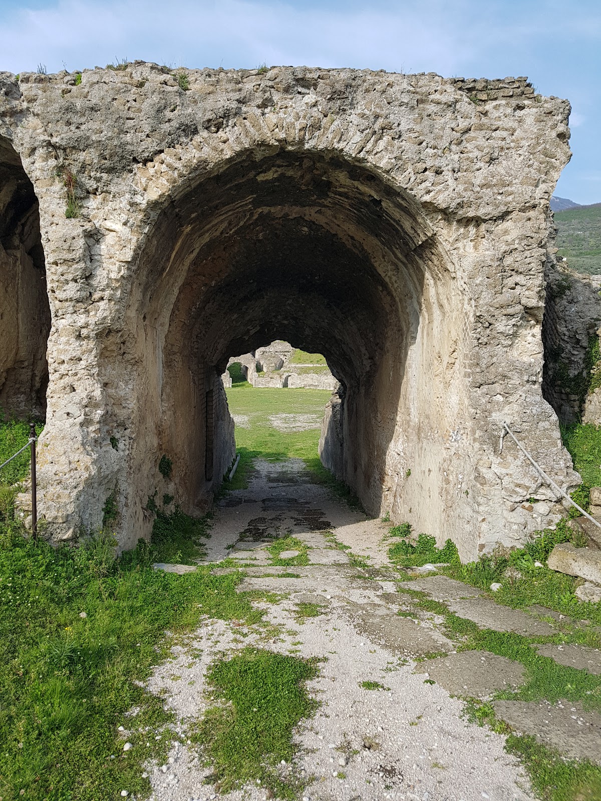 The amphitheatre of Avella has an elliptical shape measuring about 60 meters long and 35 meters wide, smaller than the amphitheatre of Pompeii but sharing a similar layout. It is oriented along its major axis and features two main vomitoria, which are entrance passages aligned with this axis, allowing spectators to enter and exit efficiently. The structure was built primarily using yellow tuff stone arranged in opus reticulatum, a Roman technique characterized by a net-like pattern of small, square stones.