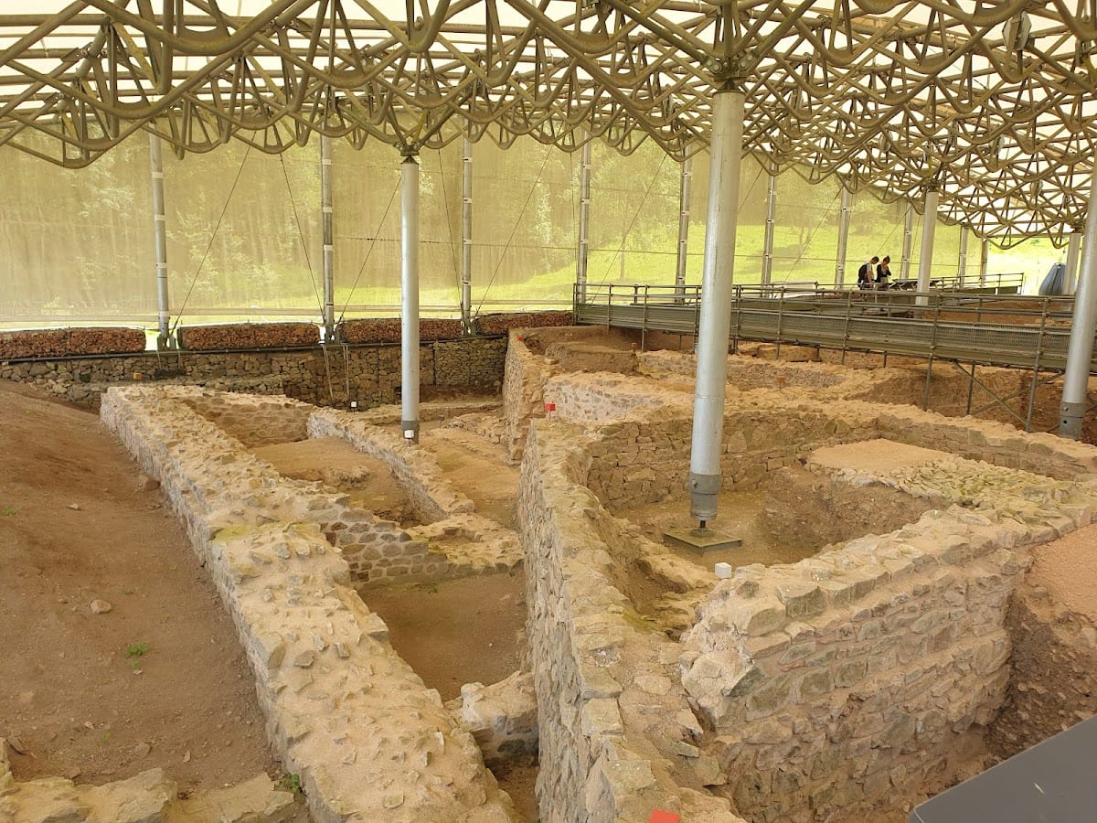 Following the Roman conquest, Bibracte experienced accelerated Romanization beginning in the late 1st century BCE. Mediterranean architectural techniques were introduced, including stone construction, atria with impluvia (central rainwater basins), hypocaust heating systems, and sewer networks. The Parc aux Chevaux plateau contains several Roman-style stone houses (domus), notably the large domus PC1, which covered approximately 3,500 square meters—about four times the size of typical Pompeian houses—indicating the presence of a wealthy local elite adopting Roman domestic customs.
