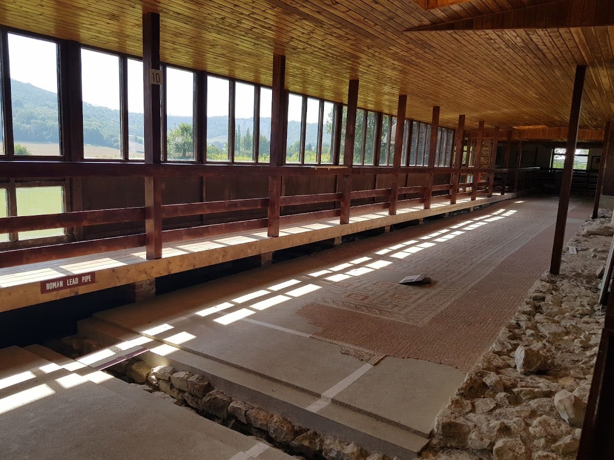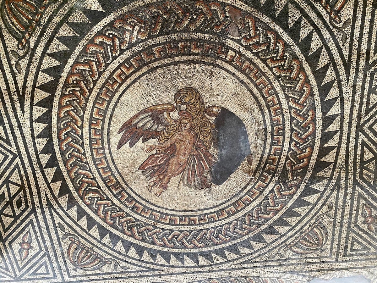 The earliest stone phase, dating to the mid-3rd century AD, includes a four-room building equipped with a hypocaust heating system and an east-facing portico. Later expansions added north and south wings, with the north wing containing the majority of the villa’s elaborate mosaics. These mosaics are exceptionally well-preserved and artistically detailed, particularly in the summer and winter dining rooms. The winter dining room was underfloor heated, demonstrating advanced Roman engineering.