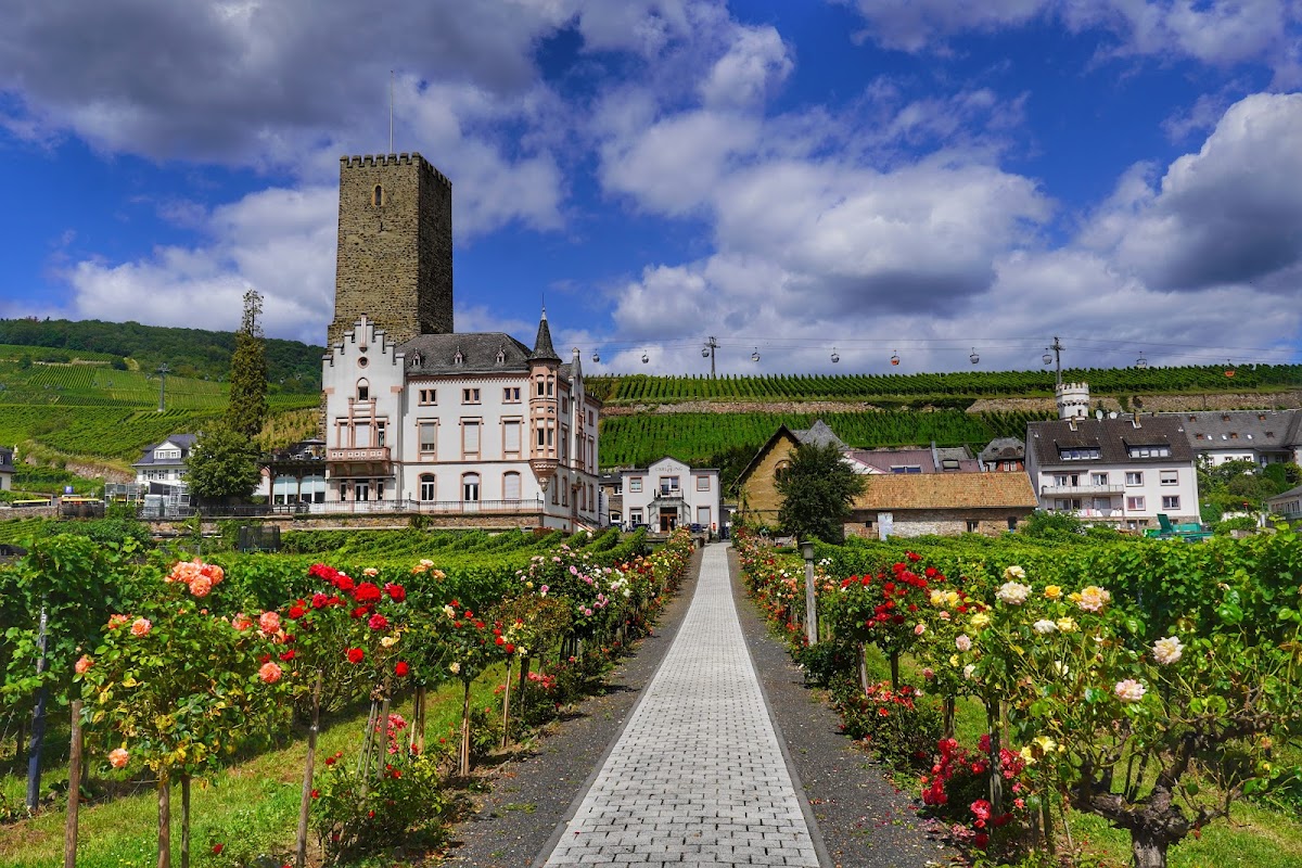 Near the castle stands a Gothic Revival villa built in 1872 for Sturm’s widow. Designed by Franz Schädel, this villa complements the historic castle setting with its period architectural style. Boosenburg is located near the ruins of another castle, the Brömserburg, which lies slightly downhill. Together, these structures overlook the Rhine valley and the surrounding vineyards, reflecting the region’s deep connection to both medieval history and viticulture.