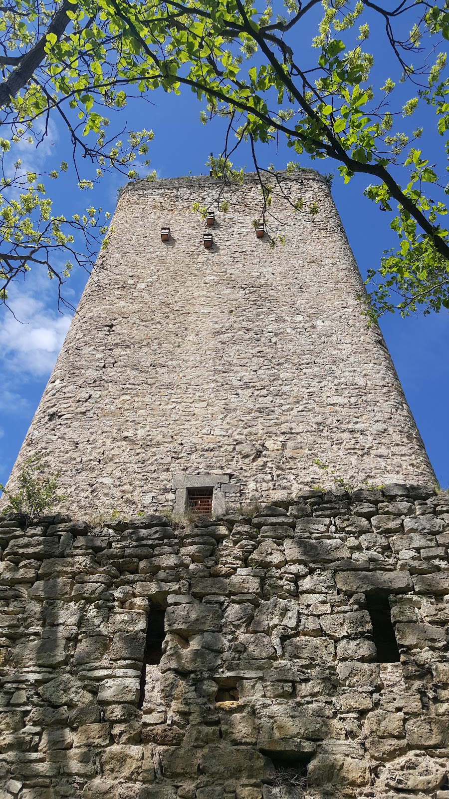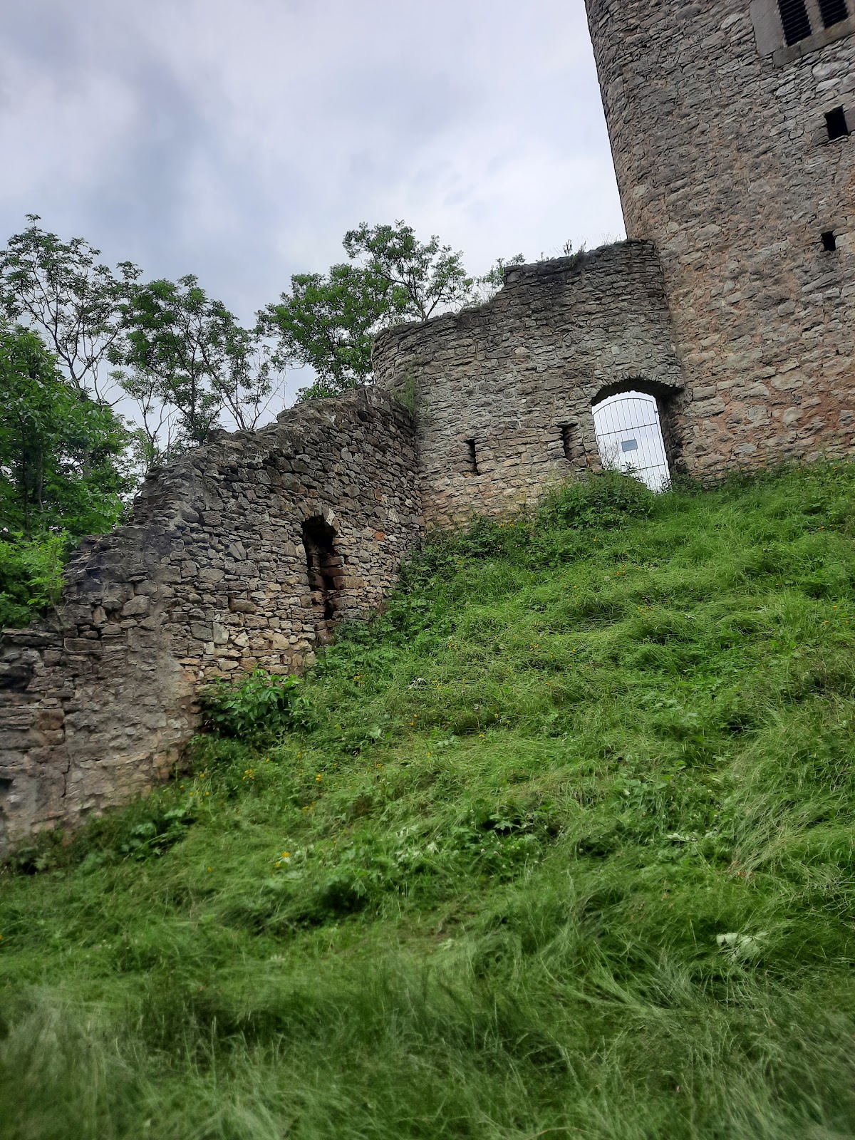 Dominating the eastern end of the palas, a massive bergfried—a type of large tower serving as a last line of defense—stands approximately 25 meters tall. It measures 7 by 10.5 meters, with wall thickness ranging from 1.7 to 2.5 meters, thickest at the base. Access to the bergfried was designed through the living quarters on the upper level of the main building, a feature that reflected both defensive and residential functions. On its southern side, one of the castle’s well-preserved details is an internal garderobe or latrine oriel, a small projecting chamber providing sanitation facilities, which offers insight into medieval hygiene arrangements.