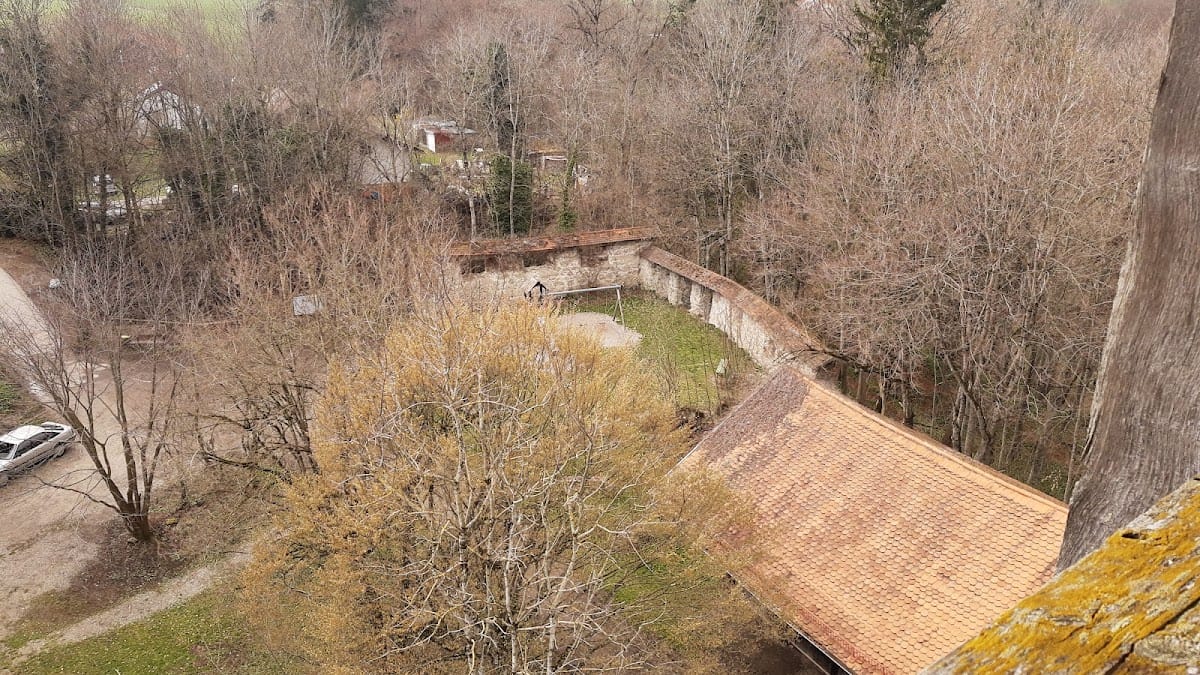 Remnants of the castle’s medieval ring wall remain primarily in the northern and southwestern sectors. These surviving sections now form the outer walls of two buildings: the Amtshaus, which still stands and is privately occupied as a tavern, and the former castle tavern, which was demolished in 1978 due to poor condition. Along the southern and eastern slopes of the spur, a shallow ditch with an embankment traces the perimeter, suggesting an outer layer of defense surrounding the castle plateau.