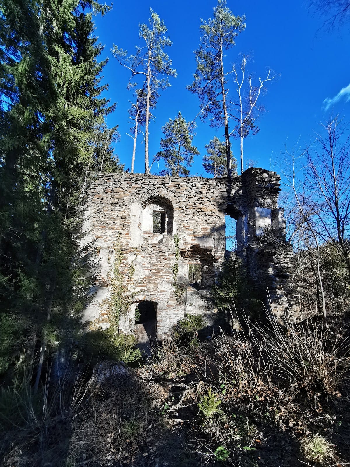 The oldest section visible today is a ring-shaped stone wall enclosing the highest western part of the site. This wall forms an elongated rectangle roughly 50 by 18 meters and is built with roughly layered rubble stone characteristic of early 14th-century construction. Attached to its western end stands a three-story residential building known as a palas, which served as the main living quarters. This palas dates to the initial building phase around 1300.