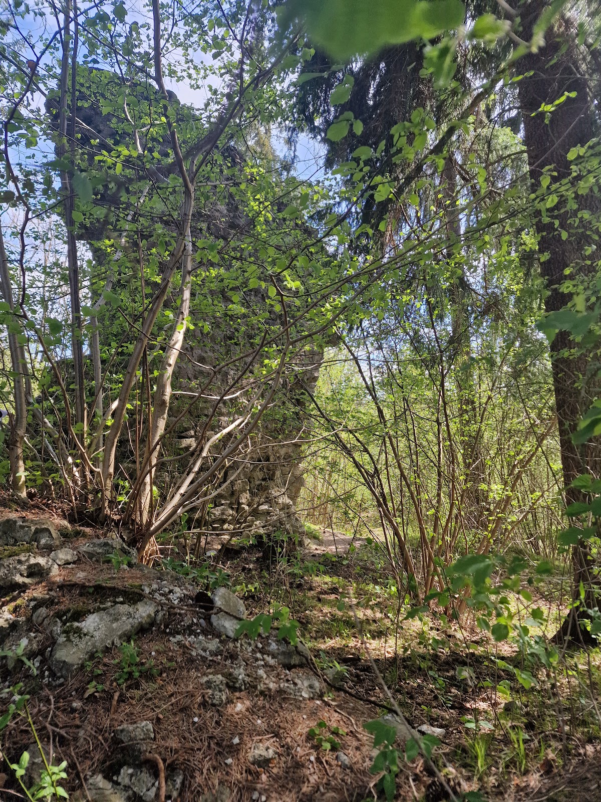 In 1893, the bergfried’s north and east walls were destroyed during an explosion carried out by a local farmer intent on harvesting stone. The remaining walls, approximately two meters thick and constructed from rubble stone, show the robust medieval masonry typical of defensive towers. To the west of the bergfried, a long section of wall still rises over three meters, once protected by an additional narrow outer enclosure resembling a zwinger—a defensive corridor intended to trap attackers.
