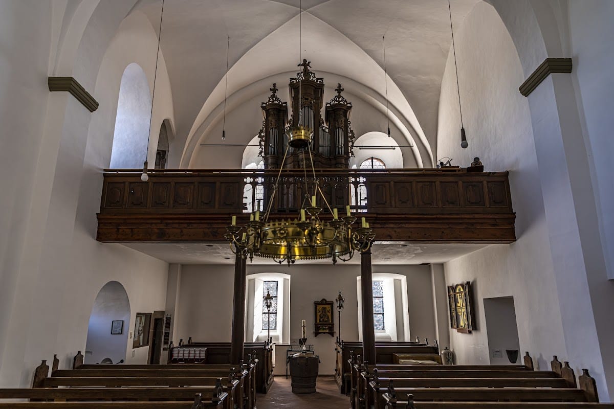 Inside the church, 18th-century altars and pulpit crafted by monks from Steinfeld Abbey remain intact. Notable wooden statues include a nearly life-size figure of John the Baptist on the high altar and a valuable oak statue of Saint Anne from the 15th century that stands about 85 centimeters tall. The altar area preserves the stone altar base and features rib and cross vaulting from the former chapel. A holy water niche and fragments of Gothic wall paintings testify to its medieval origins. Beneath the organ loft, a gold enamel depiction of the 12th station of the cross, dating from 1960, has been installed.