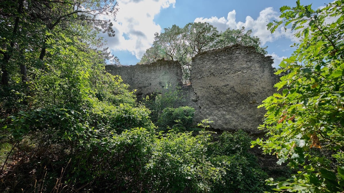At the highest point of the castle stood a pentagonal bergfried, the primary tower or keep, which served as a last refuge and stronghold. This tower rose through four floors, constructed with walls up to three meters thick to resist attack. Access to the bergfried was internal only and achieved by ladders, emphasizing its defensive role. Today, only certain sections survive, including parts of the surrounding ring wall and a segment of masonry connected to the bergfried’s base. These remnants allow observers to understand the castle’s original layout and defensive design but stand as partial vestiges of its former structure.