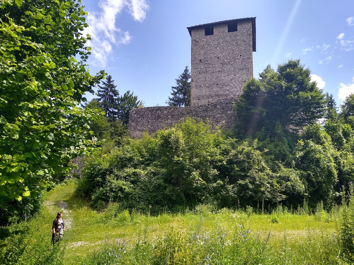 At the top, thick walls one meter wide contain two square window openings on each side, offering broad views across the adjoining Gail Valley and surrounding mountains. Large sections of the surrounding ring wall, standing between five and eight meters tall, remain in place around the site, preserving the castle’s defensive perimeter. South of the main tower, the ground floor walls of a residential building are also visible, providing further insight into the castle’s internal layout.