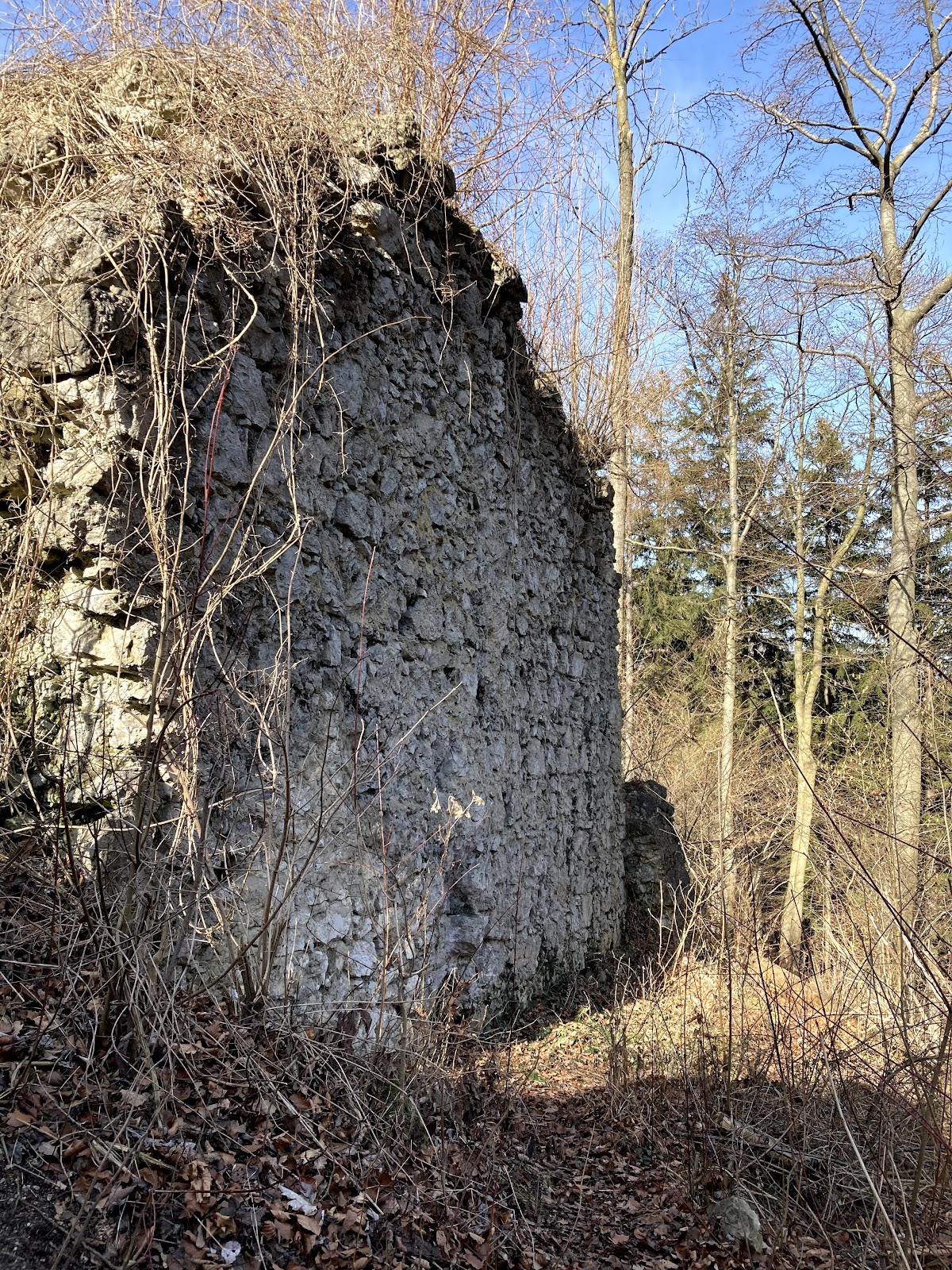 The ruins of Burgruine Kirnstein sit on a narrow spur of the Wildbarren mountain at about 520 meters elevation, rising above the valley floor on the mountain’s eastern slope. The castle’s main enclosure formed a roughly square shape measuring approximately 18 by 16 meters. Its walls, originally built from rubble stone combined with more finely cut corner stones known as ashlar blocks, were about 1.2 meters thick and survive today up to a height of eight meters in places. Most of this masonry reflects the rebuilding activities following the destruction around 1430.