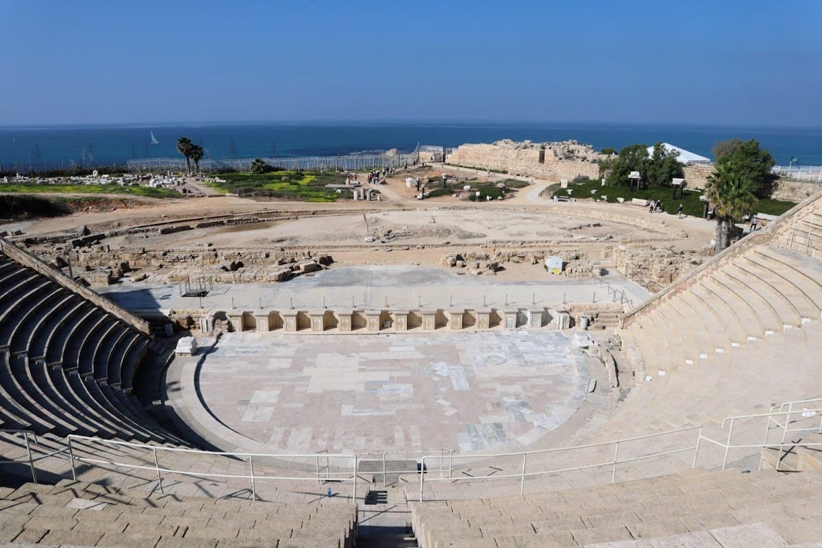Constructed during Herod the Great’s reign (circa 22–10 BCE), the theatre was built mainly of local kurkar stone and plaster. It originally seated approximately 4,000 spectators. Later additions during the reign of Emperor Septimius Severus (late 2nd century CE) included marble and porphyry columns. The theatre is situated along the coastline, providing views of the Mediterranean Sea.