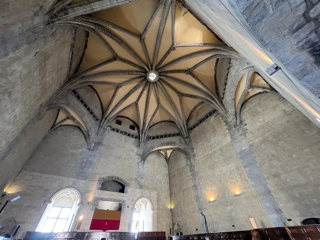 The Hall of the Barons, originally the throne room, measures roughly 26 by 28 meters and is covered by an eight-sided umbrella vault with pointed lunettes and a central opening, or oculus. Small windows allowed guards to discreetly observe the king during formal audiences. The floor was tiled with white and blue glazed majolica imported from Valencia, reflecting the period’s artistic exchanges. Inside the hall is a large fireplace flanked by two galleries designed for musicians and decorative elements including a double-sided marble portal by Domenico Gagini. Reliefs on the walls recall Alfonso V’s triumphant arrival at the castle.
