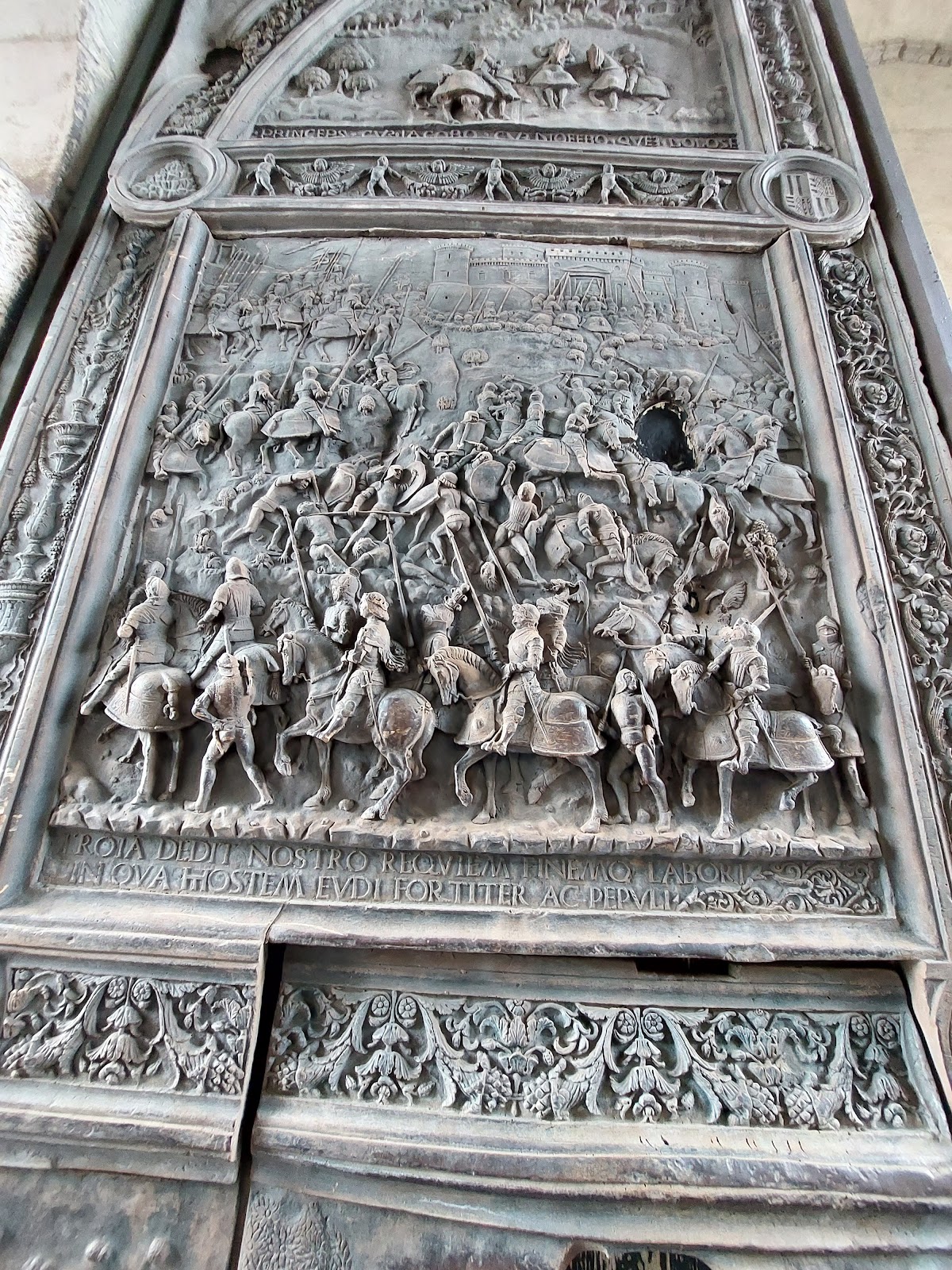 The castle complex also includes an inner courtyard, a bridge, and an atrium adorned with frescoes. A bronze entrance door, crafted by the monk Guillem of Naples, depicts scenes of Alfonso’s military victories. Various loggias and staircases connect different parts of the fortress.