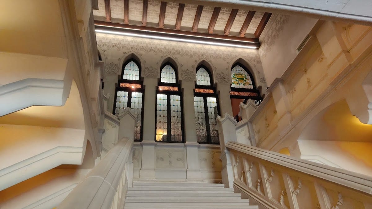 The upper floor is distinguished by a series of窗 windows arranged like a gallery, locally known as a llotja. This floor also incorporates small turrets with Nordic architectural motifs, a characteristic introduced during the 19th-century remodeling. At the top, the roof terrace features defensive elements such as machicolations—openings through which defenders could drop objects on attackers—and battlements, underscoring a stylistic revival of medieval fortification features that contrast with the building’s residential adaptations.