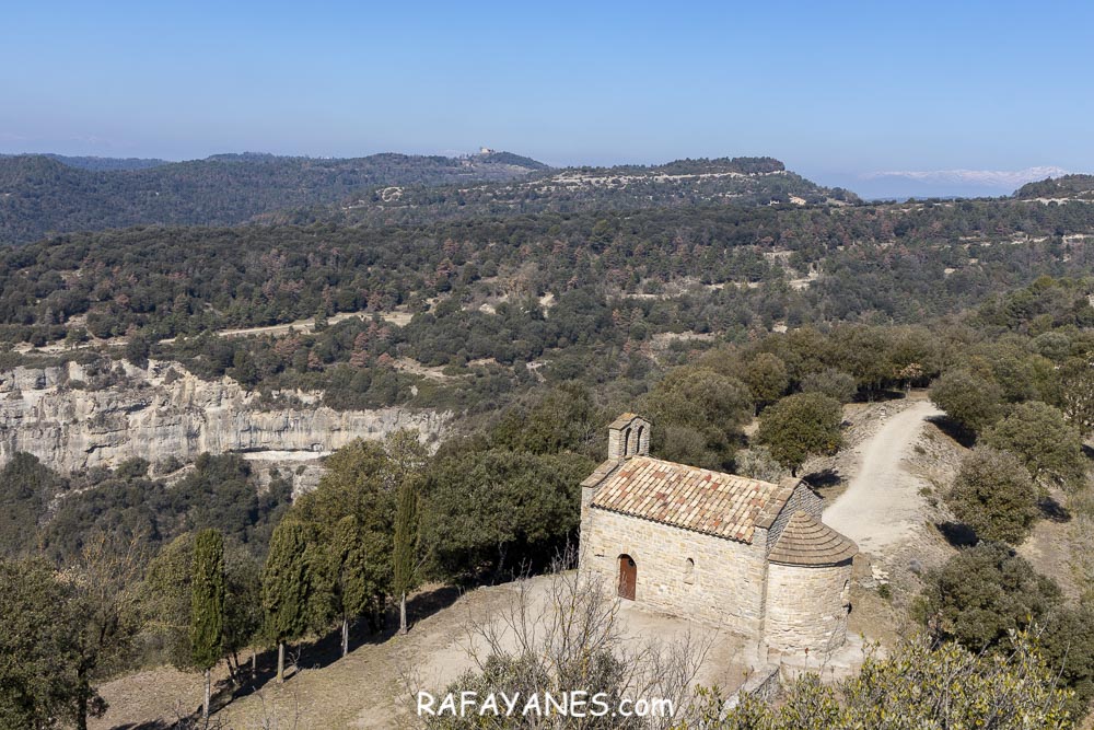 Below the castle’s enclosure sits the small church of Sant Martí Xic. Its structure consists of a single nave culminating in a semicircular apse, characteristic of medieval ecclesiastical architecture. The church’s entrance features a simple lintelled portal, and its south wall contains a narrow slit window likely designed for limited light and defense. Inside, a transverse arch separates the nave from the presbytery, and an additional transverse arch is situated centrally within the nave, which aids in supporting the roof.