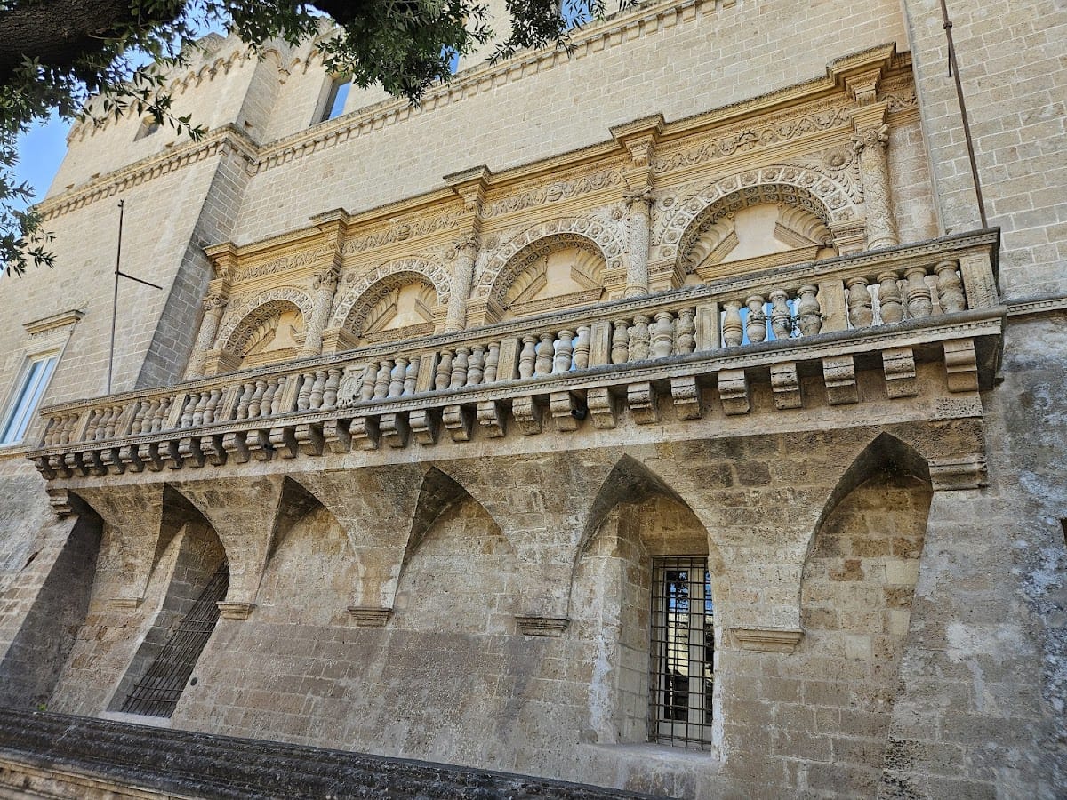 The castle’s upper floors continue this mixture of Renaissance and Baroque ornamentation. Windows on the first floor are framed with delicate designs of intertwined petals or clusters of laurel leaves inside rings, surmounted by small pediments decorated with floral garlands. The eastern façade includes a Baroque-style loggia typical of Lecce’s decorative tradition, comprising four arches embedded into the wall. Each arch encloses tall openings framed with leaf patterns and topped by broken triangular pediments with palm leaf motifs. The supporting columns rest on pedestals and hold up an animated entablature. Above the loggia, a balustrade features miniature classical columns and pilasters decorated with grapevine tendrils and rosettes, showcasing the Renaissance and Baroque blending of nature-inspired ornament and heraldic symbolism.