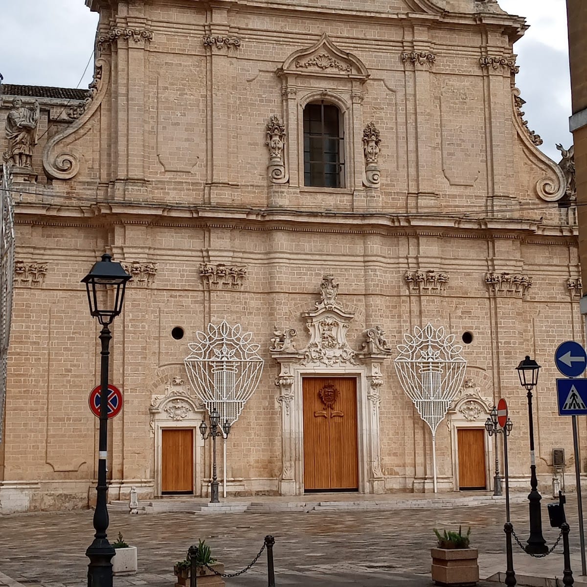 The main façade includes a finely crafted portal shifted slightly westward, framed by composite columns—columns combining Ionic and Corinthian features—resting on blocks with capitals that uphold elongated flat slabs called abaci. This entrance is richly detailed with molded and rounded frames, interrupted at the arch by the Imperiali family coat of arms, indicating their patronage. A more substantial rear portal to the east is topped by an iron balcony, a later addition enhancing the palace’s residential elegance.