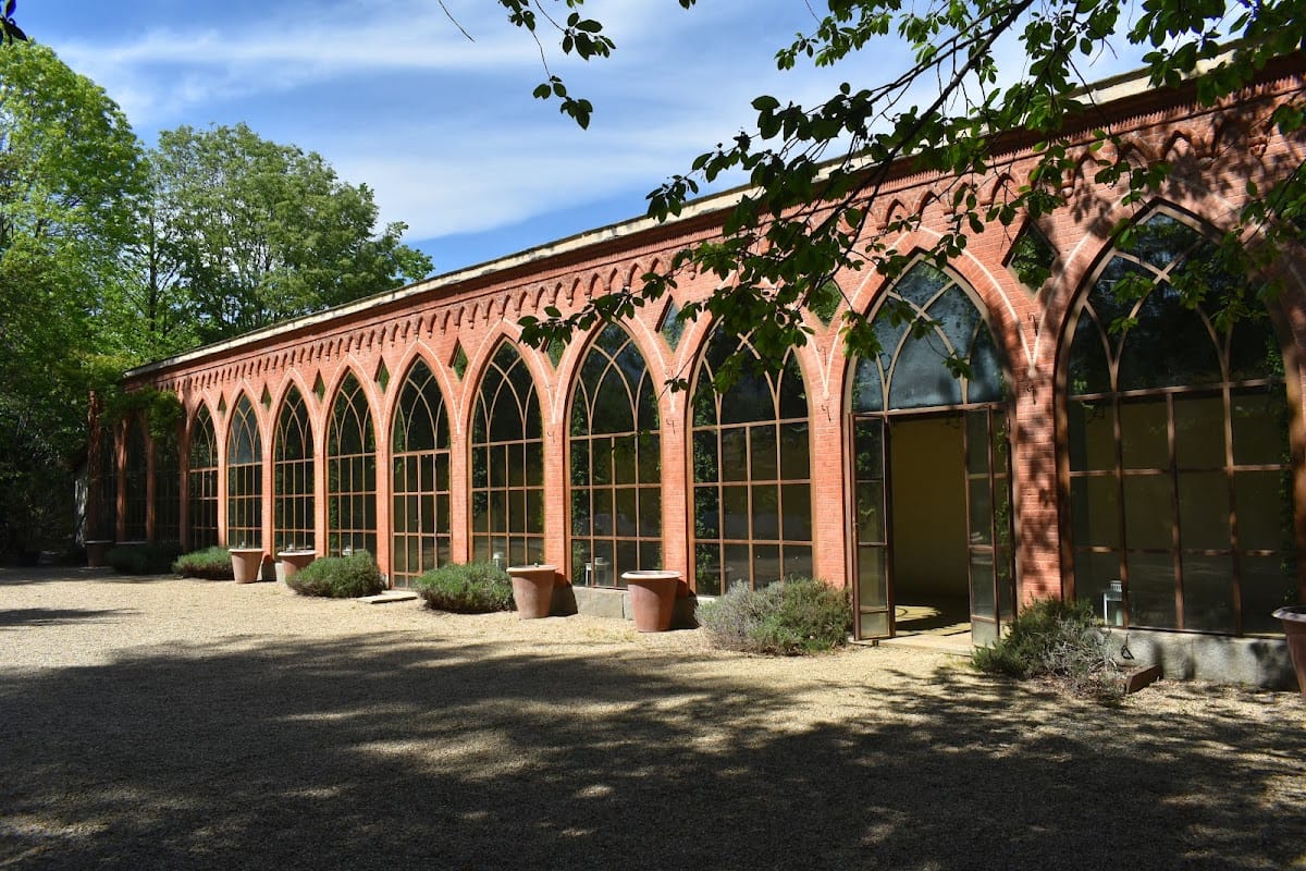 Along the southwest side, a greenhouse stands out with large pointed-arch windows topped by a terracotta cornice decorated with brick ogival arches that continue along the roofline, reflecting the ornamental style of the renovation. Inside, visitors find a spacious ground-floor hall centered around a grand carved wooden fireplace, which emphasizes the villa’s historical character. The vaulted ceilings contain significant frescoes featuring grotesque motifs—decorative paintings that incorporate intertwined vegetal and animal designs—adding artistic depth to the interior space.