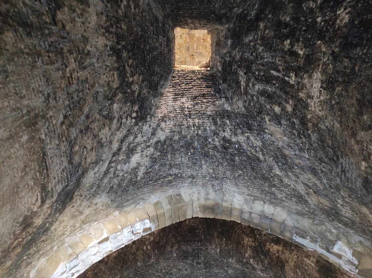 Inside, the tower ground floor comprises a rectangular chamber covered by two brick vaults supported by a central pointed arch resting on pilasters attached to the east and west walls. Light enters this space through two arrow slits near the entrance, indicating its function for defense and observation.
