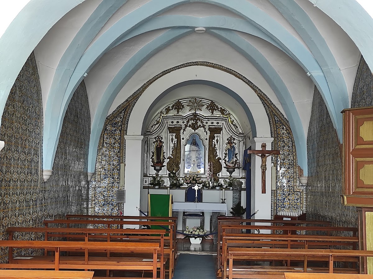 Built over the castle ruins, the Sanctuary of Nossa Senhora do Castelo is a Baroque church characterized by a single nave, chancel, sacristy, and a former pilgrims’ house. The main façade is ornamented with pilasters, volutes (spiral scroll-like decorations), and topped by a gable and cross. The church’s interior boasts 17th-century polychrome azulejos, which are painted ceramic tiles featuring maize motifs. Architectural elements include a barrel-vaulted former galilee (a porch or chapel area integrated into the nave) and a ribbed cross vault thought to have survived the devastating 1755 earthquake. The chancel contains a barrel vault and a richly carved Baroque altar in white and gold, with Rococo niches housing a wooden image of the sanctuary’s patron saint.