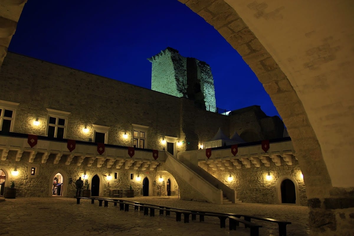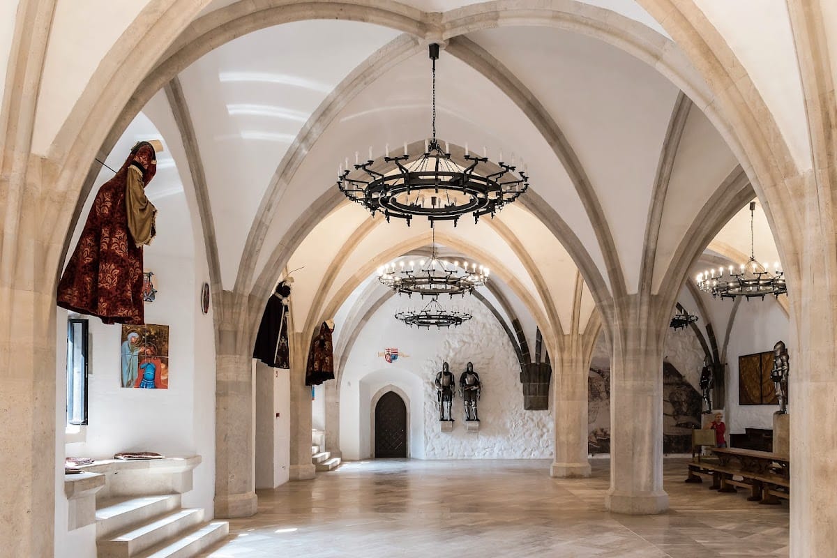 During King Louis I’s reign, the fortress was reconstructed around a rectangular courtyard bounded by four corner towers, each crowned by pointed roofs. The ground floor primarily housed storerooms and economic spaces necessary for the castle’s functioning, while the upper floor contained residential chambers and most notably, a large knights’ hall measuring 13 by 25 meters. This hall was designed as a two-nave space supported by three columns and is recognized as the largest of its kind in Central Europe.