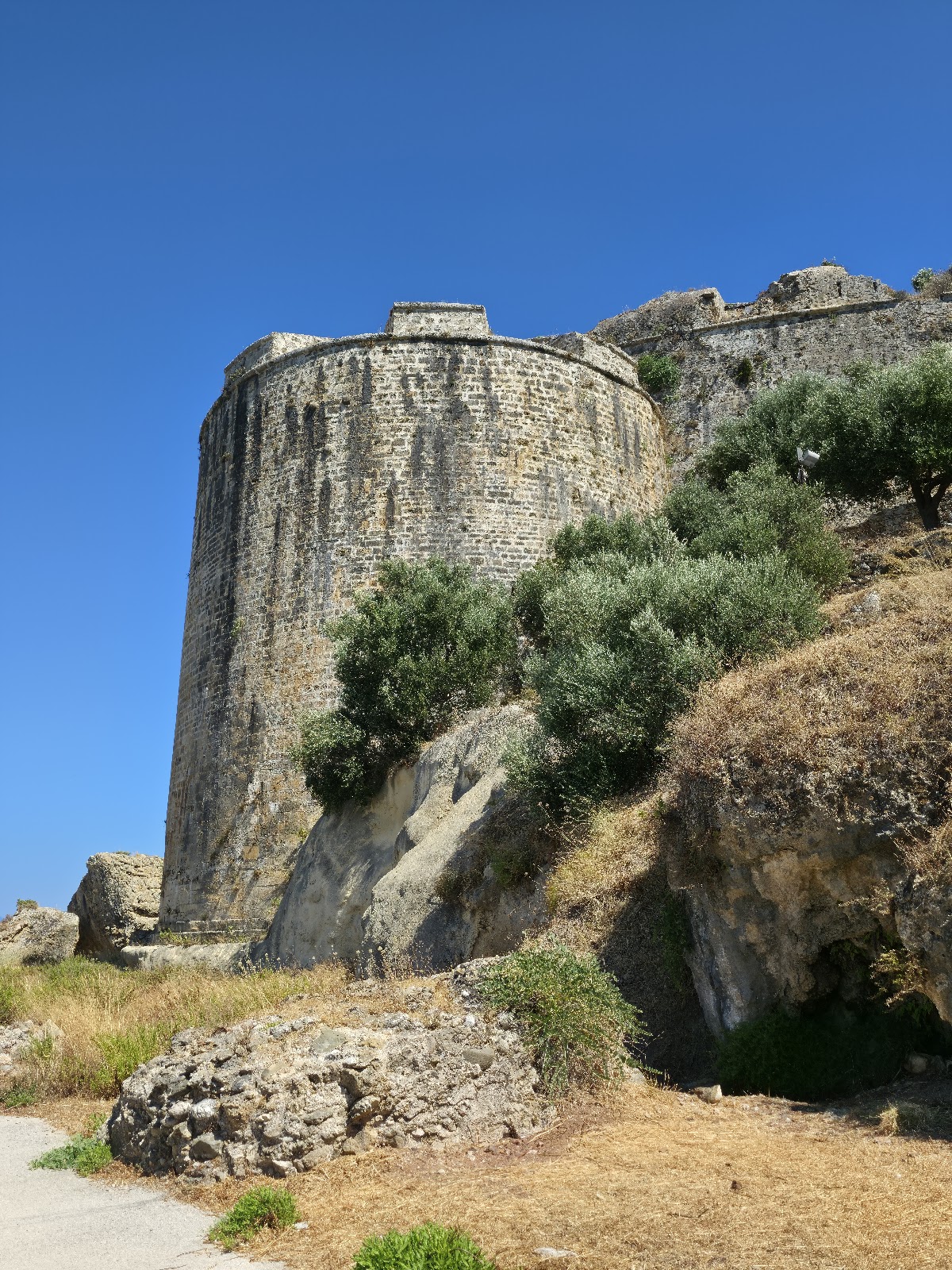 The Castle of Koroni occupies a roughly triangular area, encircled by strong defensive walls interspersed with square towers and storage spaces for gunpowder, known as powder magazines. Its fortifications reflect layers of construction from Byzantine, Venetian, and Ottoman periods. One of the castle’s northern bastions was deliberately destroyed by German troops during World War II, leaving only ruins in that section.