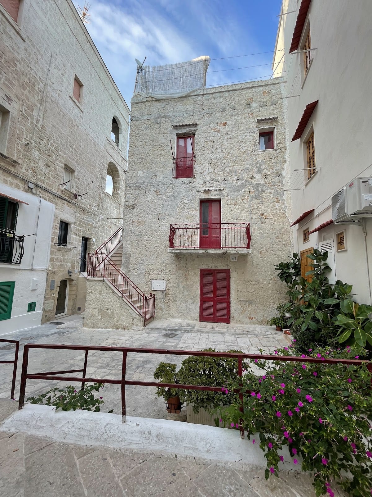 The Castle of Monopoli presents a pentagonal layout marked by five bastions at its corners, a simple design reflective of Renaissance military architecture adapted for coastal defense. The primary entrance once featured a drawbridge on the southwest side, which led from a small ramp to a later-added cylindrical tower. Adjacent to this tower are well-preserved segments of ancient walls, visibly linking the newer structures to earlier periods.