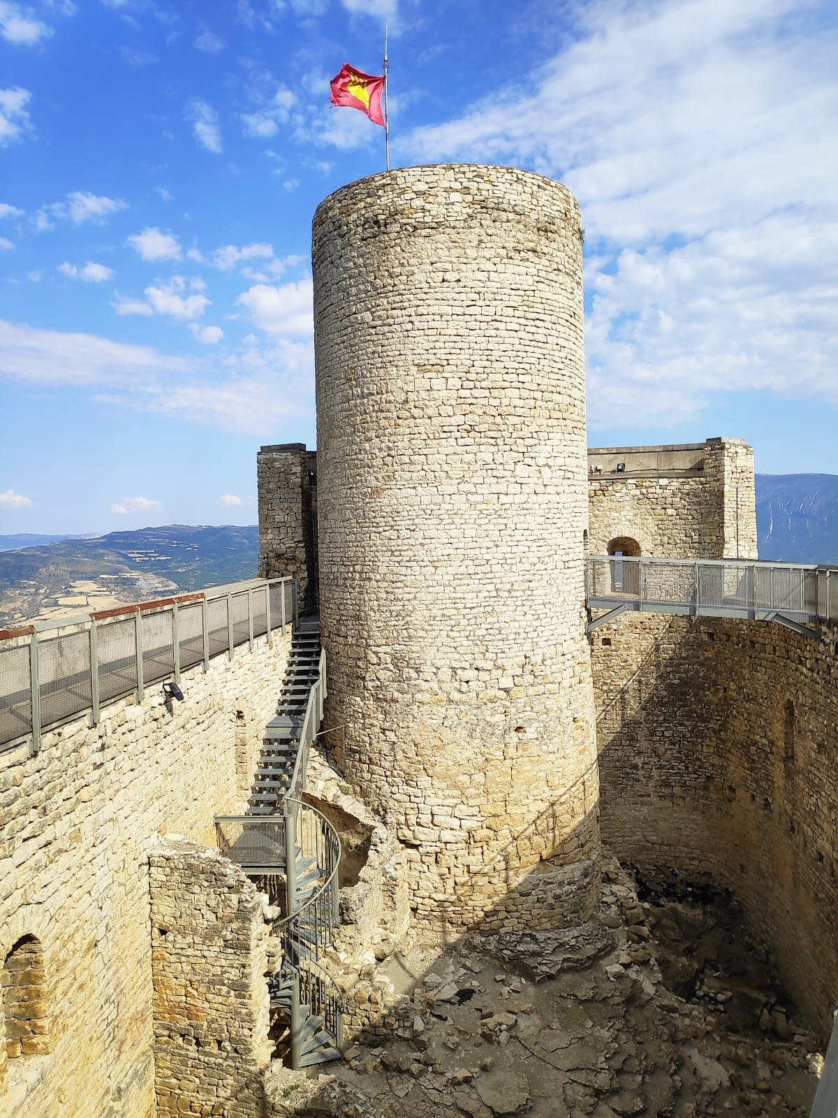 Within the castle walls, few significant internal buildings survive today, though traces of minor walls suggest spaces that once housed service rooms or storage. Marks on the interior stonework indicate the former presence of wooden beams, which would have supported floors and roof structures. Along the perimeter walls are various slit windows and blind arches whose precise functions remain unclear but contribute to the fortress’s architectural complexity. Archaeological investigations have also uncovered remains of a nearby medieval village associated with the castle, featuring large cyclopean stone walls—constructed with massive, irregular stones—and floors carved directly into the bedrock, illustrating the broader settlement organized around the fortress. The castle underwent several construction phases, from an early 10th- or 11th-century tower base through a mid-11th-century Romanesque form, continuing with modifications until the 15th century, after which it ceased functioning as a stronghold. Today, the keep has been restored further, presenting a well-preserved example of medieval military architecture actively studied for its historical value.