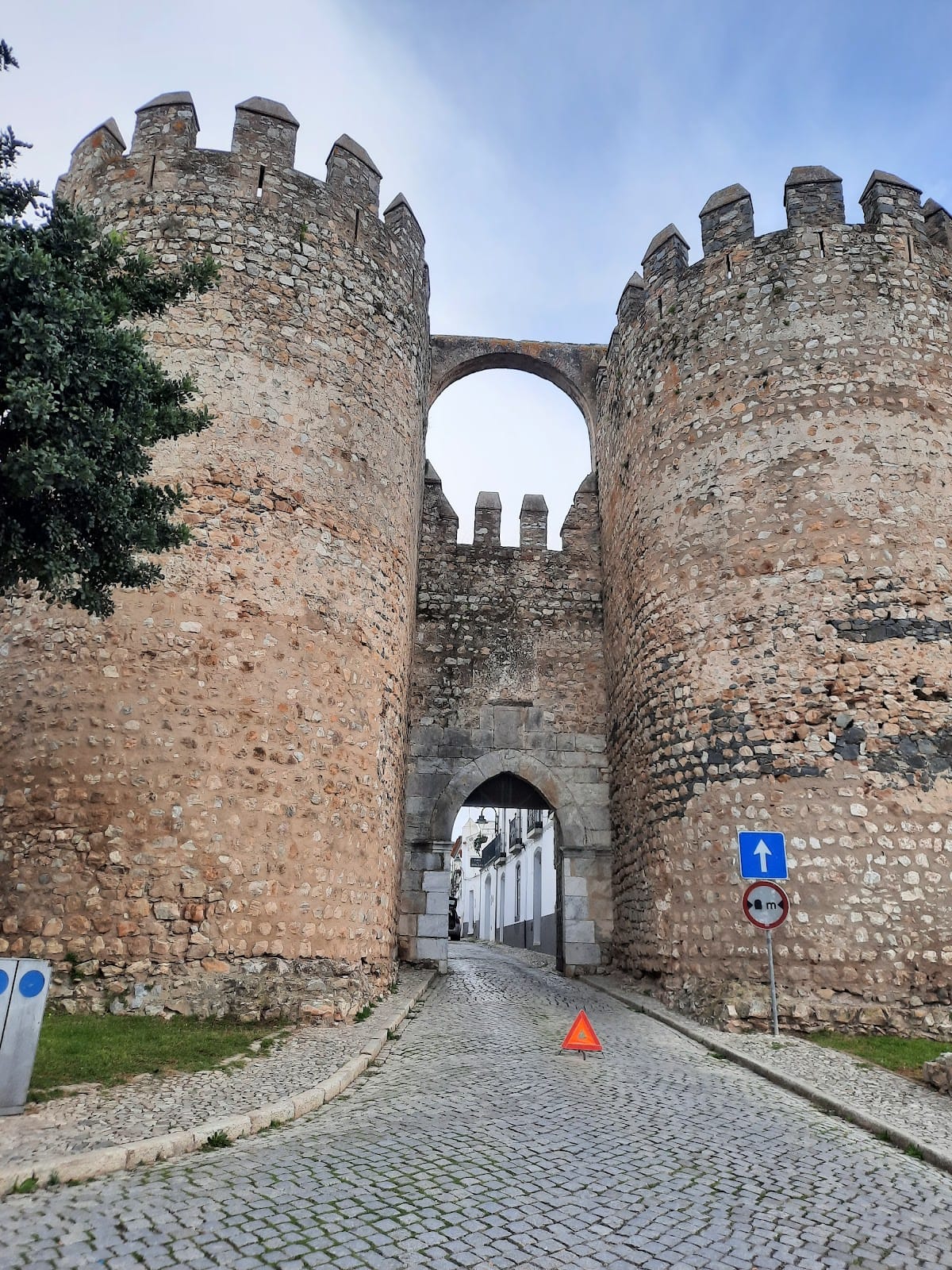 The Castle of Serpa is situated within the historic core of the town, positioned on elevated ground around 230 meters above sea level. Its defensive walls form an irregular oval shape, strengthened by rectangular and semicircular towers. These walls are crowned with prismatic battlements—solid, upright stone blocks designed to protect defenders. Originally, the town had three large main gates: Porta de Moura in the northeast, Porta de Beja to the northwest, and the now-lost Porta de Sevilha to the south. Each gate was flanked by two cylindrical towers with chamfered edges topped by distinctive five-sided merlons, which are the stone projections atop battlements.