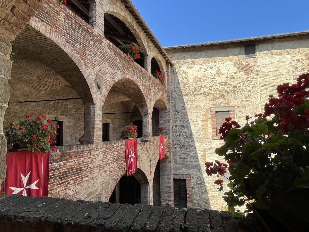 In its earliest phase, the castle functioned primarily as a place of hospitality, supporting those undertaking religious pilgrimages. Over time, its role expanded as it gained significance not only for travelers but also within the organization’s hierarchy. By the 15th century, the site underwent a transformation from a simple hospitium into a fully fortified castle. This change reflected shifting needs during a period of increasing political instability in Italy. The Knights enhanced the complex with defensive features such as a round tower, battlements, and robust corner towers, while simultaneously upgrading the internal spaces to accommodate noble residents, including richly decorated rooms on the first floor.