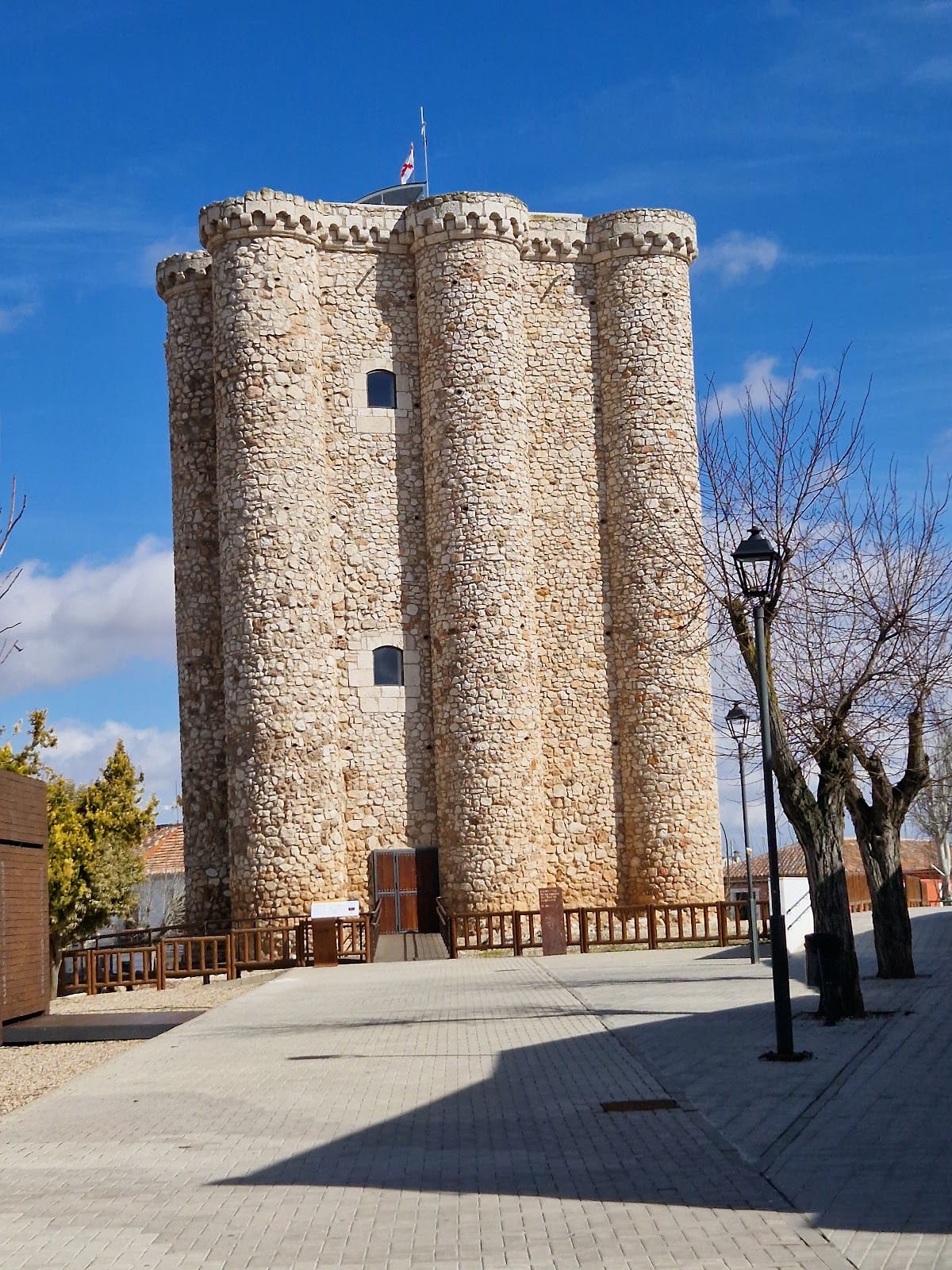 One distinctive architectural detail is the arrangement of cylindrical turrets, or cubillos, along the sides of the tower. Unlike typical Spanish castles where turrets appear at the corners, here three turrets run along each side flanking the main structure, marking a rare and notable design choice in local castle construction. The tower’s limited openings include a few windows framed with carefully cut stone blocks, called ashlar, which provide structural strength and refined finishing.
