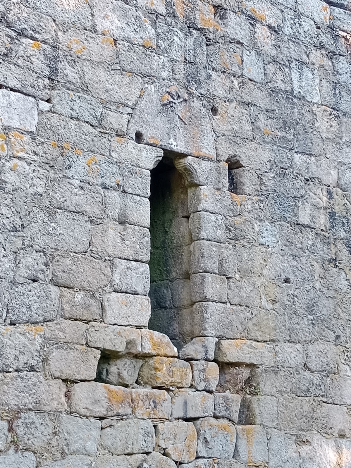 Several carved decorative elements survive on the keep’s exterior. The north face includes an arched doorway set at the second-floor level, topped by a semicircular lintel bearing a relief that appears to depict a warrior, possibly shown playing a bagpipe, a distinctive figure that may have symbolic or cultural significance. On the western side, a window includes an arch and tympanum featuring a shield adorned with six round shapes known as roeles, which represent the heraldic emblem of the Castro family.