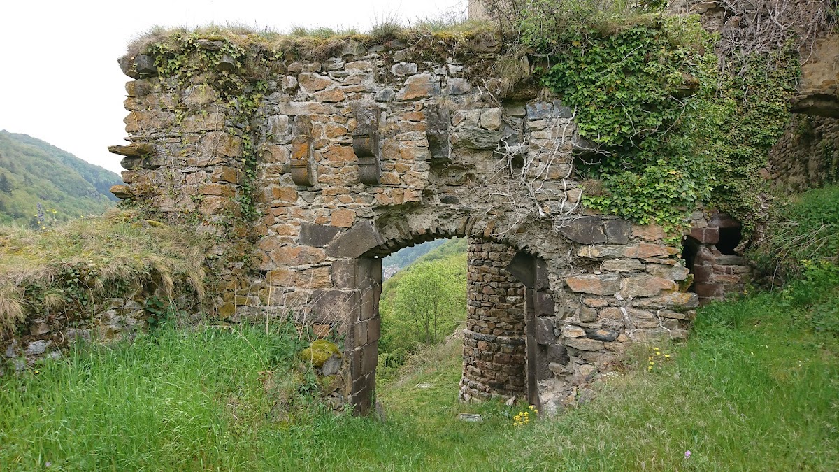 Within the ruins, traces of a large hall once remained identifiable about fifty years ago. This space contained heraldic decorations, including the helmet insignia of the Bouillé family and shields bearing the coats of arms of Rochefort d’Aurouze, Astorg d’Orlhac, and Courcelles families. These embellishments suggest the castle served as a noble residence where lineage and alliances were visually asserted through symbolic stone carvings.