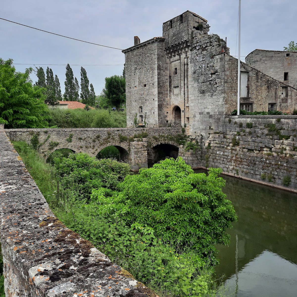 The Château de Cherveux boasts an irregular pentagonal layout, enclosed by broad moats filled with water drawn from a nearby high-altitude spring. These natural defenses are complemented by a solid stone wall encircling the castle grounds. Entry is granted via a fixed bridge featuring three arches, which crosses the moat and leads directly to a grand carriage gate. This gate is surmounted by a battlemented wall walk fitted with seven machicolations—stone openings used historically for dropping projectiles or other defenses onto attackers below. The passageway beneath the gate is vaulted, allowing secure, covered access through the gatehouse.