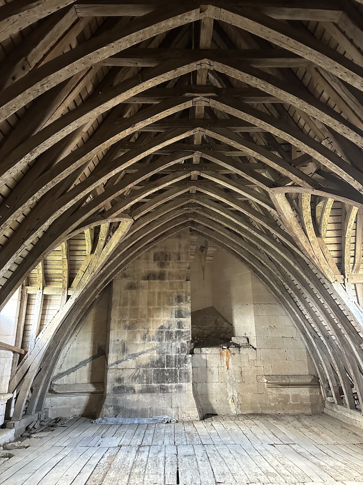 Surrounding the donjon are various connected buildings, linked by polygonal towers and turrets that create a harmonious yet asymmetrical architectural composition. The main residential building, known as the corps de logis, is attached to the donjon and rises four levels high. Within it, the large meeting hall is notable for its timber roof shaped like an inverted boat hull and coated with lime plaster, which serves both as insulation and fire protection. Above this hall’s dome-shaped ceiling, the acoustics are exceptional.