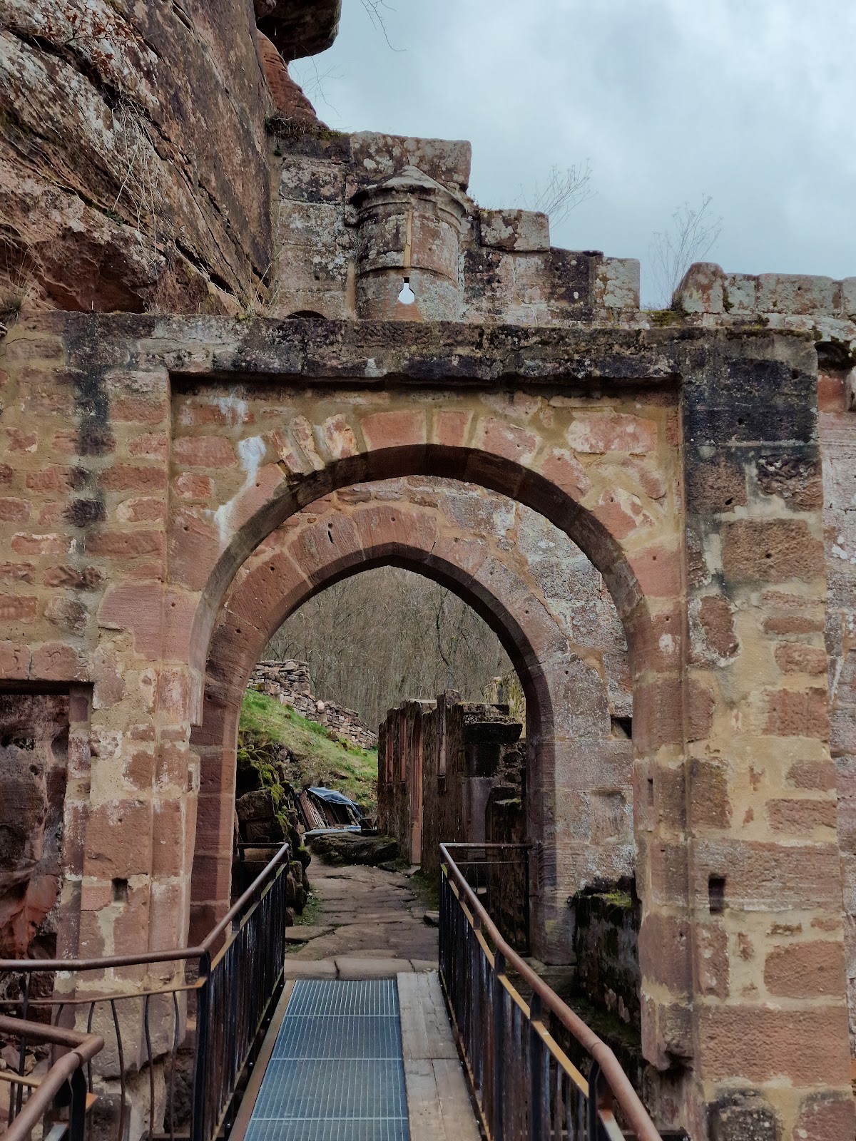 The castle’s masonry dates mostly from the mid-13th century, built from locally quarried Buntsandstein sandstone. The construction combines rubble stone with finely shaped ashlar blocks typical of the 16th century in Alsace. Notable among the defensive features is the southern entrance, secured by a 16th-century outer ditch and two square bastion towers. The eastern tower contains two artillery openings, known as Maulscharten, designed for firing small arms or light guns, while walls of the western tower rise up to two meters today.