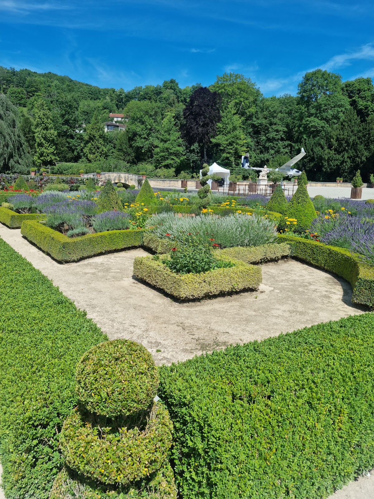 The Renaissance garden draws from limited documentary sources and literary descriptions, including those by the 16th-century poet Rémy Belleau. It features two parterre gardens located to the east and south of the building, subdivided into seven distinct compartments with intricate boxwood patterns framing some 140 geometric topiaries. The layout includes a boxwood labyrinth, an arbor, a trellis-covered cabinet, and a canal. A large orchard with 360 fruit trees is arranged in geometric patterns, planting varieties such as pear, apple, plum, quince, and cherry. Squares dedicated to aromatic, medicinal, and cut-flower plants complement the design. Since 2006, an additional collection of 56 yew topiaries inspired by geometric and natural forms has been added.