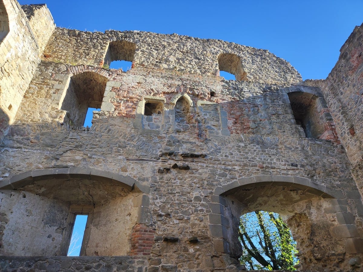 Parts of the principal residential and administrative building remain visible, including walls adorned with Gothic ornamental details. These fragments offer clues to the castle’s role beyond pure defense, suggesting spaces designed for noble living and administration.