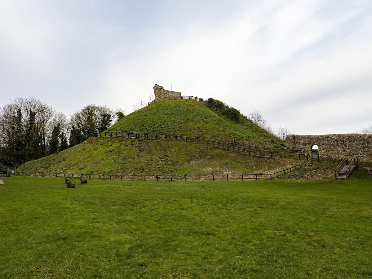 To the north and east of the motte lie two baileys, originally enclosed by deep ditches and steep wooden palisades. The inner bailey was linked to the outer by a causeway or possibly a drawbridge, and protected further by a bend in the nearby Chilton Stream. In the 13th century, its defenses were upgraded with stone curtain walls reaching between 6 and 9 meters in height, made of flint and rubble. Sections of these walls remain as fragmentary ruins.