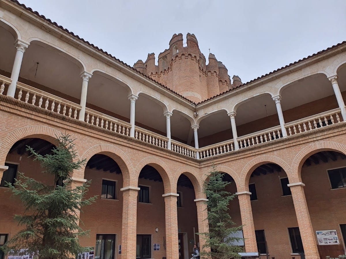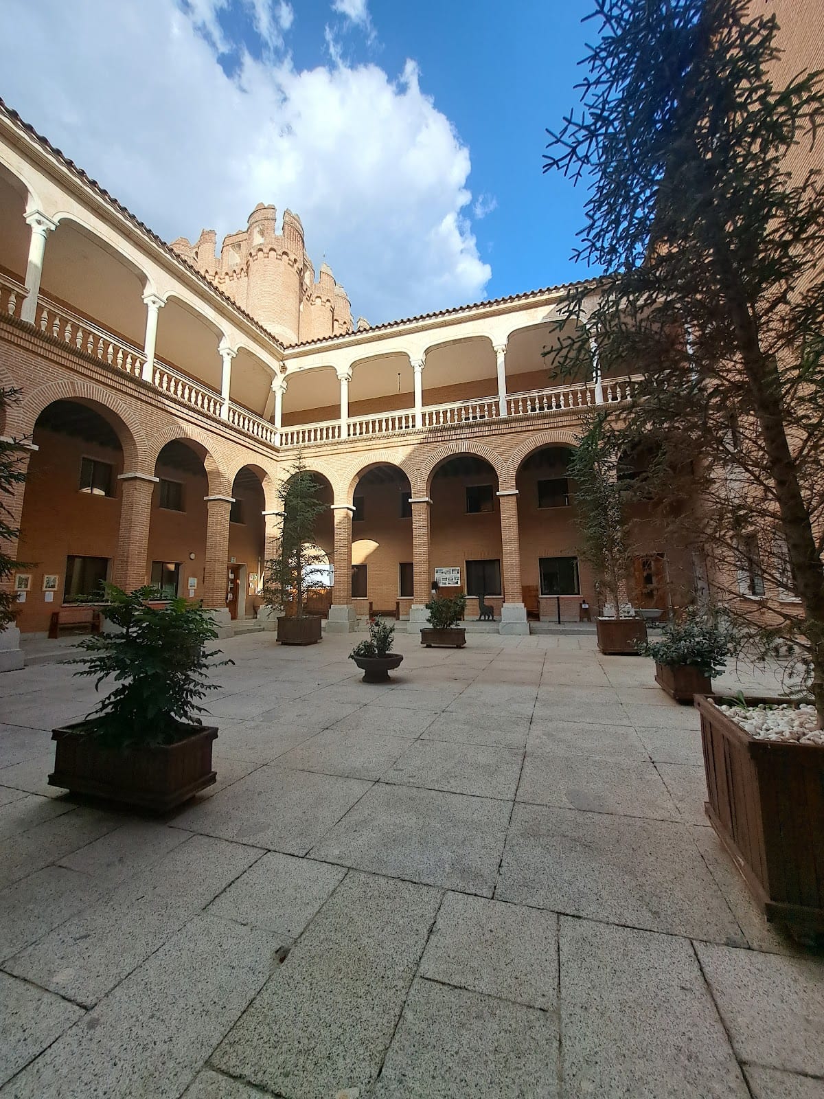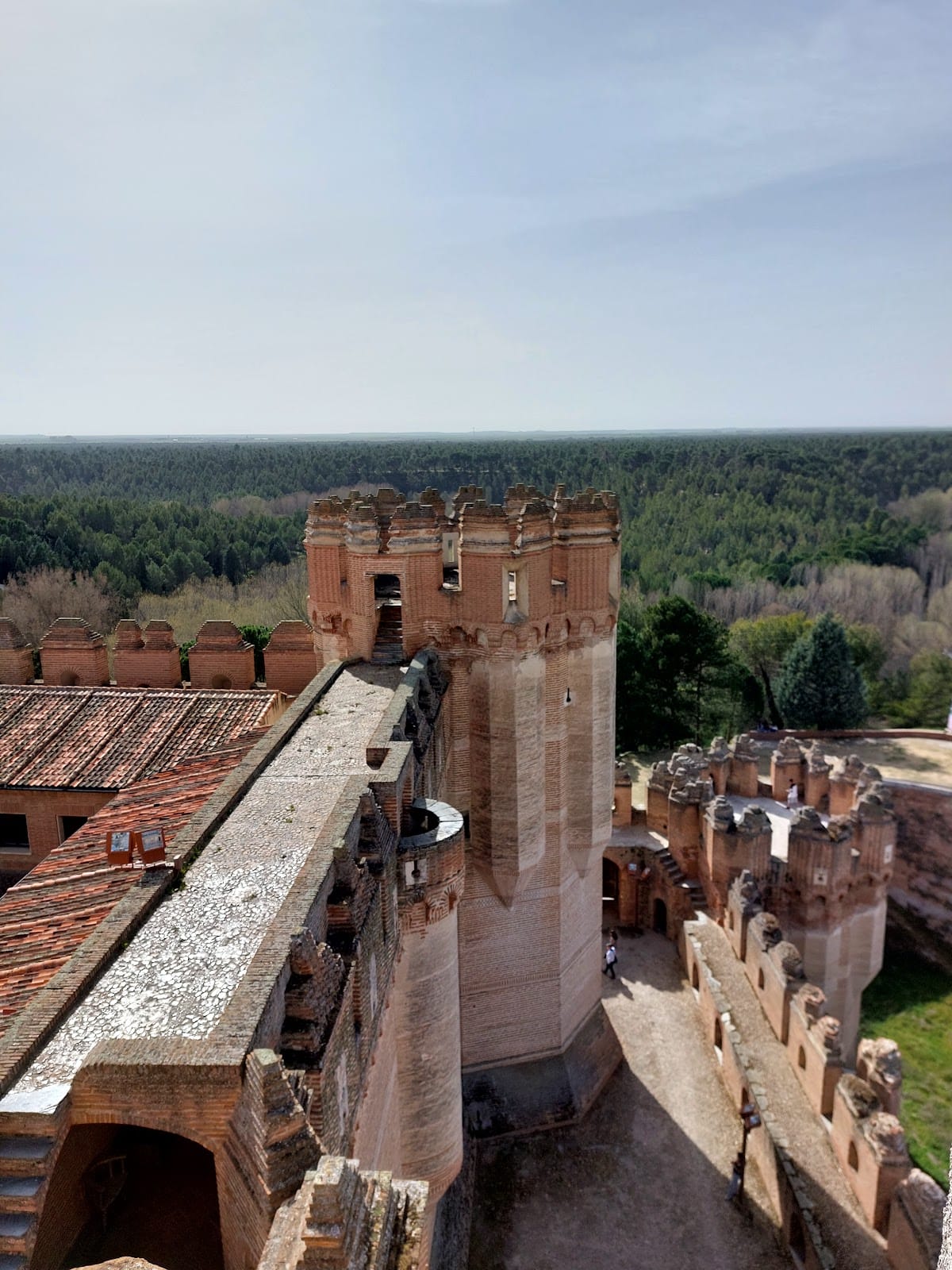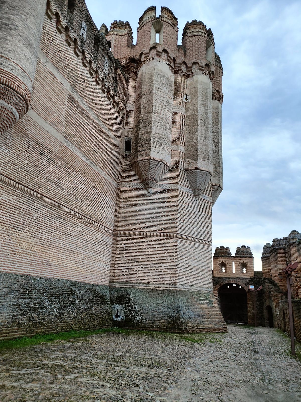 The castle’s defenses consist of three main layers. Two concentric curtain walls surround the central keep, with a deep and wide moat encircling them. Historically, the moat remained dry. The outer curtain wall is partially ruined but still marked by surviving rectangular towers. The inner curtain wall features cylindrical towers at the center of each side, smaller turrets, a machicolated wall (a wall with openings for dropping objects on attackers), and a sloping base called a talus that extends down to the moat. The battlements combine ornamental and functional features, with projecting crests made of Mudéjar brickwork.