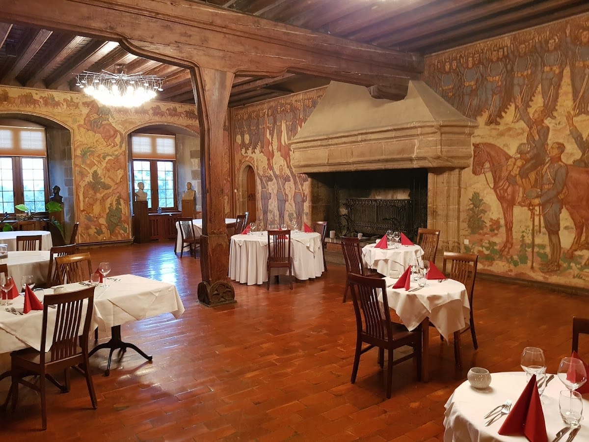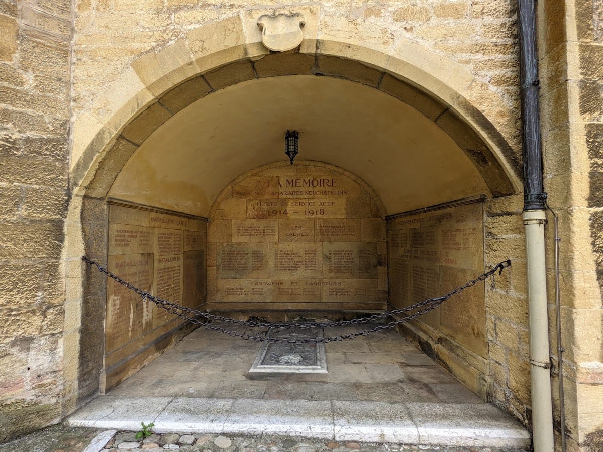 Inside the castle, large murals by Charles L’Eplattenier decorate the Knights’ Hall and the Arms Hall. Painted between 1915 and 1946, these murals depict Swiss military mobilization during World War I and the early history of the Swiss Confederation. The site also contains commemorative sculptures, including a World War I memorial from 1921, a statue of Jean Linder created in 1928 and donated in 1939, and a bas-relief of Henri I d’Orléans-Longueville made by Paulo Röthlisberger in 1953.