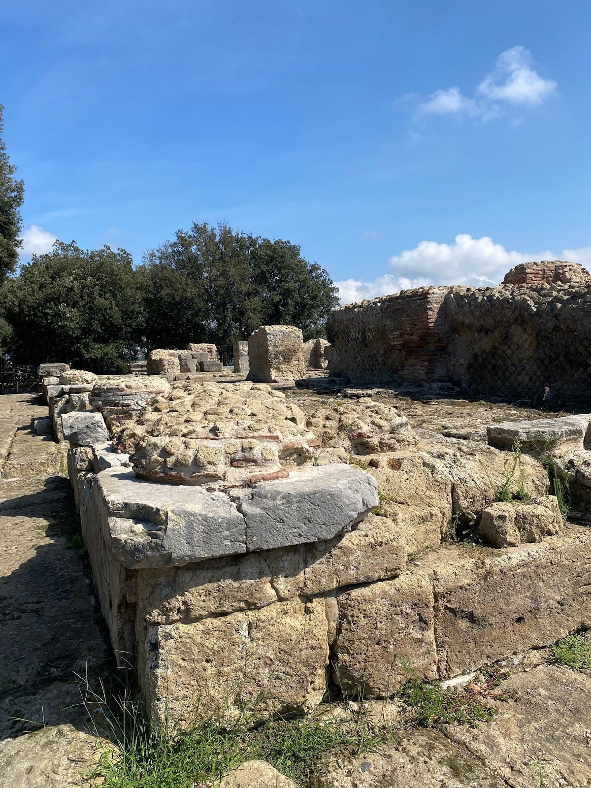 Cuma’s population stabilized under Imperial rule, maintaining a blend of Romanized locals and immigrant families. Social hierarchy remained pronounced, with elites sponsoring public works and religious institutions. Inscriptions and architectural remains indicate continued municipal administration and religious leadership. Economic activities included agriculture, artisanal production, and service industries. The Baths of the Forum and Central Baths exemplify advanced engineering and public health infrastructure, serving both hygienic and social functions. The amphitheater hosted spectacles until its late-antique conversion to ceramic production, reflecting economic adaptation. Dietary remains confirm continued consumption of Mediterranean staples, with evidence of fish and olive oil production. Domestic interiors featured vaulted rooms, mosaic decoration, and functional spaces such as kitchens and storage. Trade networks supplied imported luxury goods alongside local products. Religious life transitioned markedly as pagan temples were converted into Christian basilicas. The Temple of Isis, active until the 2nd century CE, illustrates religious diversity prior to Christian dominance. Educational and cultural activities likely included Christian catechesis and public readings, though direct evidence is limited. Cuma functioned as a municipium with civic institutions adapting to imperial and religious transformations.