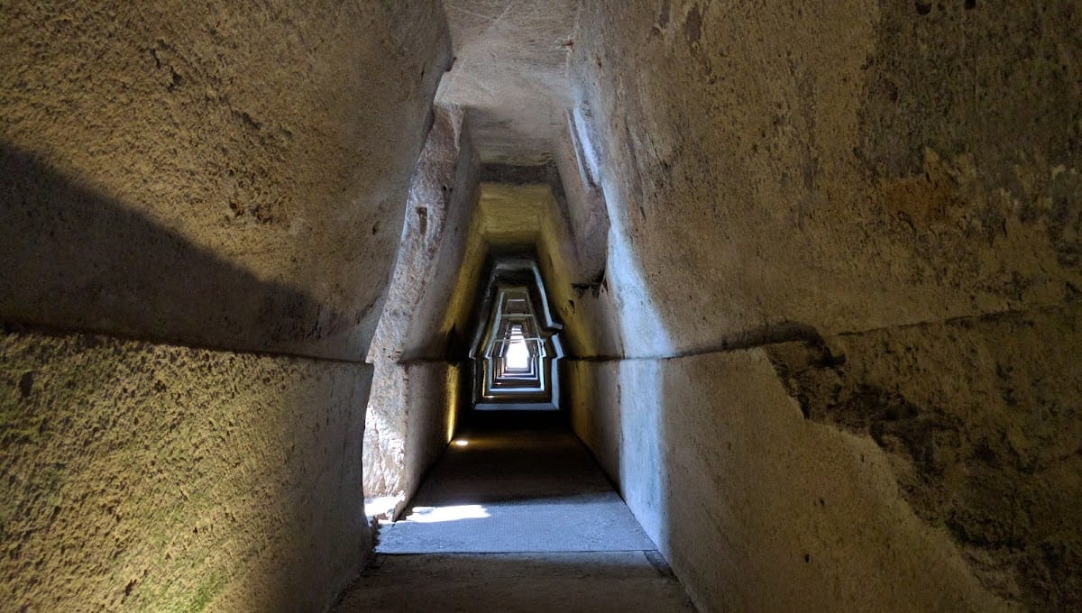 The site includes an extensive network of subterranean passages. The Crypta Romana, built in the Augustan age by Lucius Cocceius Auctus, is a roughly 300-meter-long tunnel linking the port area to the lower city beneath the acropolis. It remained in use until the 2nd century CE before partial collapse blocked sections; the intact portion was later adapted as a paleochristian necropolis. Byzantine restoration followed, but the tunnel suffered damage during the Greco-Gothic wars in 552 CE. The Grotta di Cocceio, constructed contemporaneously, extends about one kilometer, connecting the port of Cuma with the port on Lake Lucrino. It varies between 5 and 6 meters in width and is illuminated by six vertical shafts. Portions remain unexplored, particularly a branch toward the amphitheater, and the tunnel partially collapsed during World War II due to stored ordnance explosions.