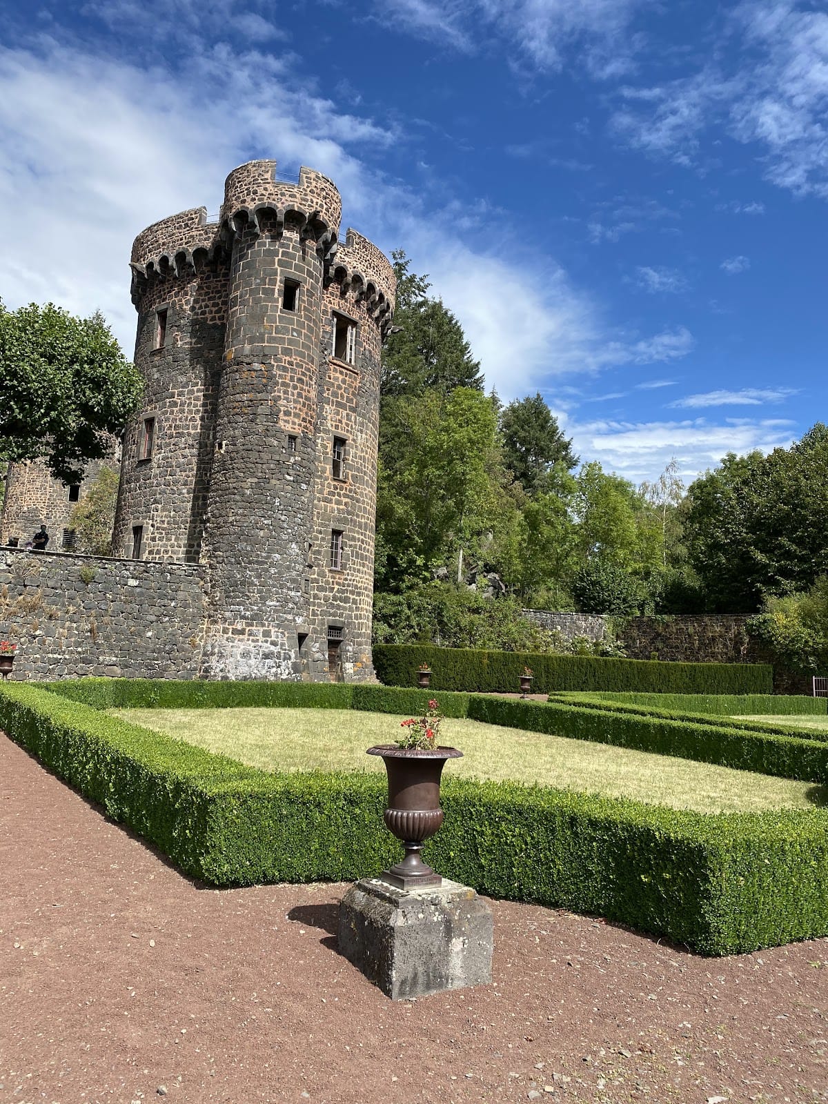 The castle was modernized in the 19th century with electricity generated by a hydraulic turbine on the nearby Sioule River. Running hot and cold water were also installed during this period. Outbuildings on the property include a museum building, a carriage house, a farm, and a 19th-century dovecote constructed from lava stone near the farm tower. The farm tower itself is recognized as a historic structure.