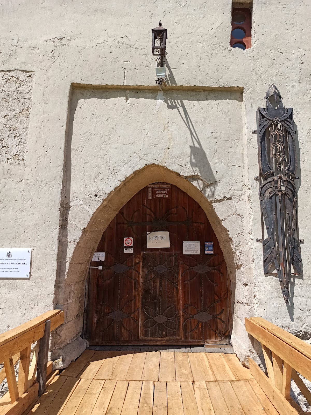 Defensive elements are prominent throughout the structure. Narrow slits in the walls, known as embrasures or arrow slits, allowed defenders to shoot arrows or firearms while remaining protected. The uppermost chamber beneath the roof, called the battlemented “podsybittya,” contains a row of openings enabling defenders to fire downward and defend the tower’s base from attackers. The northern and southern walls preserve grooves that once held gates under pointed arches, with the southern wall facing a moat. This moat has been preserved and includes a reconstructed drawbridge, highlighting the tower’s role in controlling access.