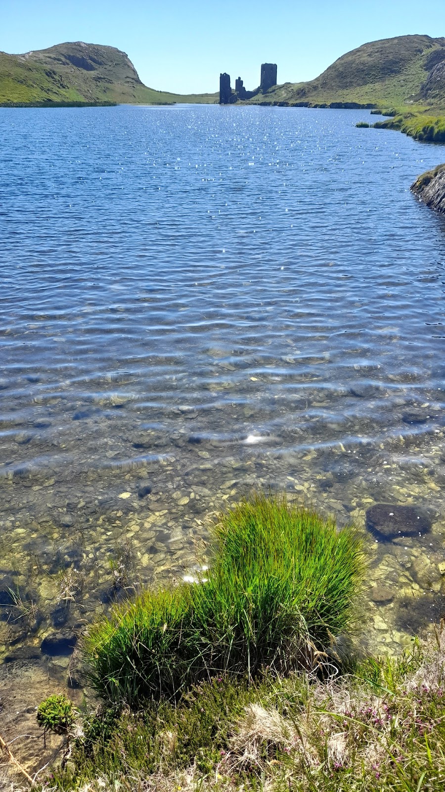 The three main towers rise to three stories each and are arranged from west to east along the narrow isthmus known as Three Castle Head. Positioned between steep cliffs and overlooking a man-made lake secured by a dam, these towers and the connecting wall formed an imposing defense system. The eastern tower served as the gatehouse, controlling access over the isthmus, although its original gateway is now largely ruined. A notable feature inside this tower is a spiral staircase, partially visible today due to erosion of the external wall.